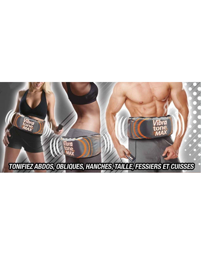 CEINTURE VIBRATONE MAX Affichez un ventre plat, une silhouette sexy et des muscles bien définis en 2 semaines La ceinture Vibratone Max est une ceinture vibrante abdos et fessiers. Tonifiez vos abdo, obliques, hanches, taille, fessiers et cuisses Affichez un ventre plat, une silhouette sexy et des muscles bien définis en 2 semaines Grâce à Vibratone Max vous éliminez vos zones de surpoids en quelques minutes par jour. Ses vibrations répétées à très grande vitesse permettent de combattre efficacement les zones de surpoids. Vous allez ainsi tonifier, muscler et raffermir tout votre corps. Et tout cela sans effort La Ceinture Vibratone Max se montre efficace grâce à une technologie à vibrations oscillantes : elle vibre de 500 à 900 fois par minute. Cela engendre une action réflexe d'étirement qui se traduit par des contractions musculaires involontaires, rapides et intenses. Ces vibrations sont conçues pour décomposer les cellules de graisses en acides gras et en glycérol. Vous pouvez alors éliminer les cellules de graisse tout simplement en transpirant. La ceinture Vibratone Max s'utilise branchée sur un secteur. Elle n'est pas autonome pour fonctionner à l'extérieur sans être branchée sur une prise électrique. Le lot comprend : - 1 Vibratone Max avec sa télécommande - 1 adaptateur - 1 sac de transport - 1 notice d’utilisation - 1 guide diététique - 1 mètre ruban
