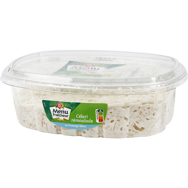 Ingrédients : Céleri 70 % ; sauce type rémoulade 24 % (eau, huile de colza, moutarde de Dijon (eau ; graines de moutarde ; vinaigre d'alcool ; sel), vinaigre d'alcool, amidon modifié de pomme de terre, sel, œufs entiers en poudre, épaississants : gomme xanthane ; gomme guar, arôme naturel de poivre) ; fromage blanc 0% de matières grasses 2,8 % ; vinaigre d'alcool ; eau ; sel ; sucre ; conservateur : E202.
