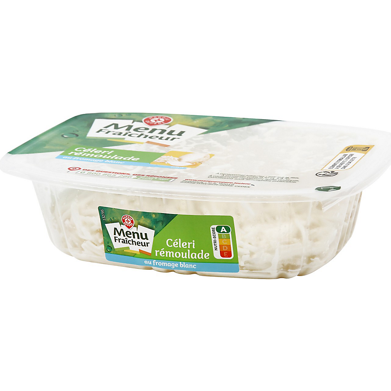 Ingrédients : Céleri 70 % ; sauce type rémoulade 24 % (eau, huile de colza, moutarde de Dijon (eau ; graines de moutarde ; vinaigre d'alcool ; sel), vinaigre d'alcool, amidon modifié de pomme de terre, sel, œufs entiers en poudre, épaississants : gomme xanthane ; gomme guar, arôme naturel de poivre) ; fromage blanc 0% de matières grasses 2,8 % ; vinaigre d'alcool ; eau ; sel ; sucre ; conservateur : E202.