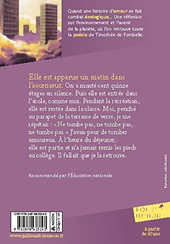 Elle est apparue un matin dans l'ascenseur. On a monté cent quinze étages en silence. Puis elle est entrée dans l'école, comme moi. Pendant la récréation, elle est restée dans la classe. Moi, penché au parapet de la terrasse de verre, je me répétais : "Ne tombe pas, ne tombe pas, ne tombe pas". J'avais peur de tomber amoureux. À l'heure du déjeuner, elle est partie et n'a jamais remis les pieds au collège. Il fallait que je la retrouve. Titre recommandé par l'Éducation nationale en classe de 6e et 5e
