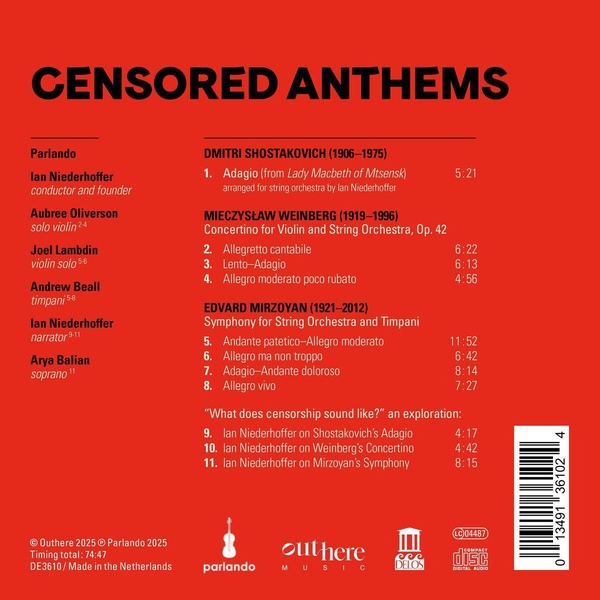 Avec des accolades telles que Musical America New Artist et BBC Rising Star, Ian Niederhoffer est un jeune chef d''orchestre en pleine ascension. Il aborde ici, avec son orchestre Parlando, la musique comme instrument de résistance culturelle face à la censure, et particulièrement celle de l''Union soviétique. Trois pièces composent ce programme très riche: l''Adagio provenant de Lady Macbeth du district de Mtsensk, une oeuvres de Chostakovitch mise à l''index suite à la critique de Staline; le Concertino pour violon et orchestre à cordes de Mieczyslaw Weinberg, un compositeur dont la carrière a souffert les campagnes de persécution anti-cosmopolite de Staline; et enfin la Symphonie pour orchestre à cordes et timbales de Edvard Mirzoyan qui se veut un témoignage puissant d''une survie culturelle malgré la russification soviétique.