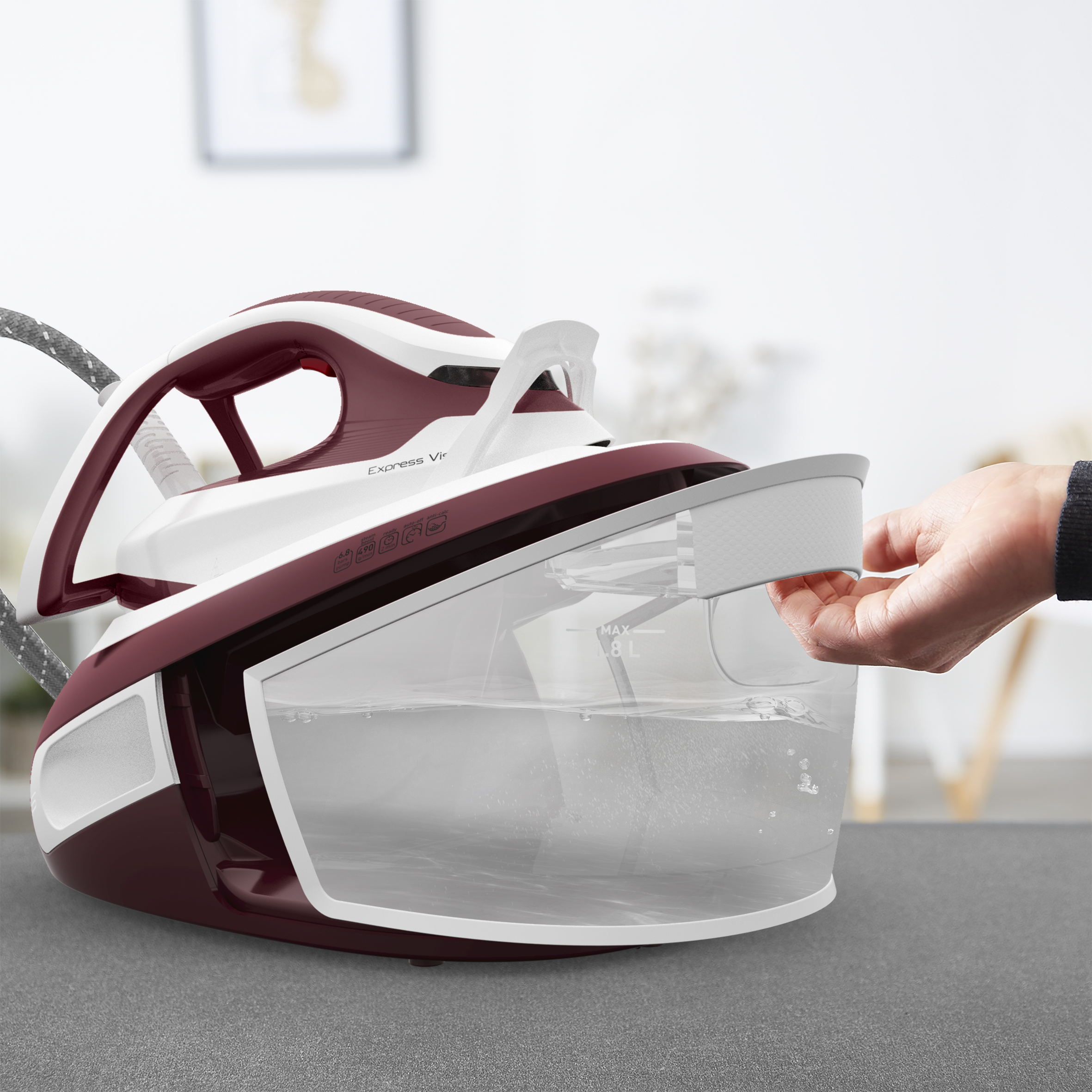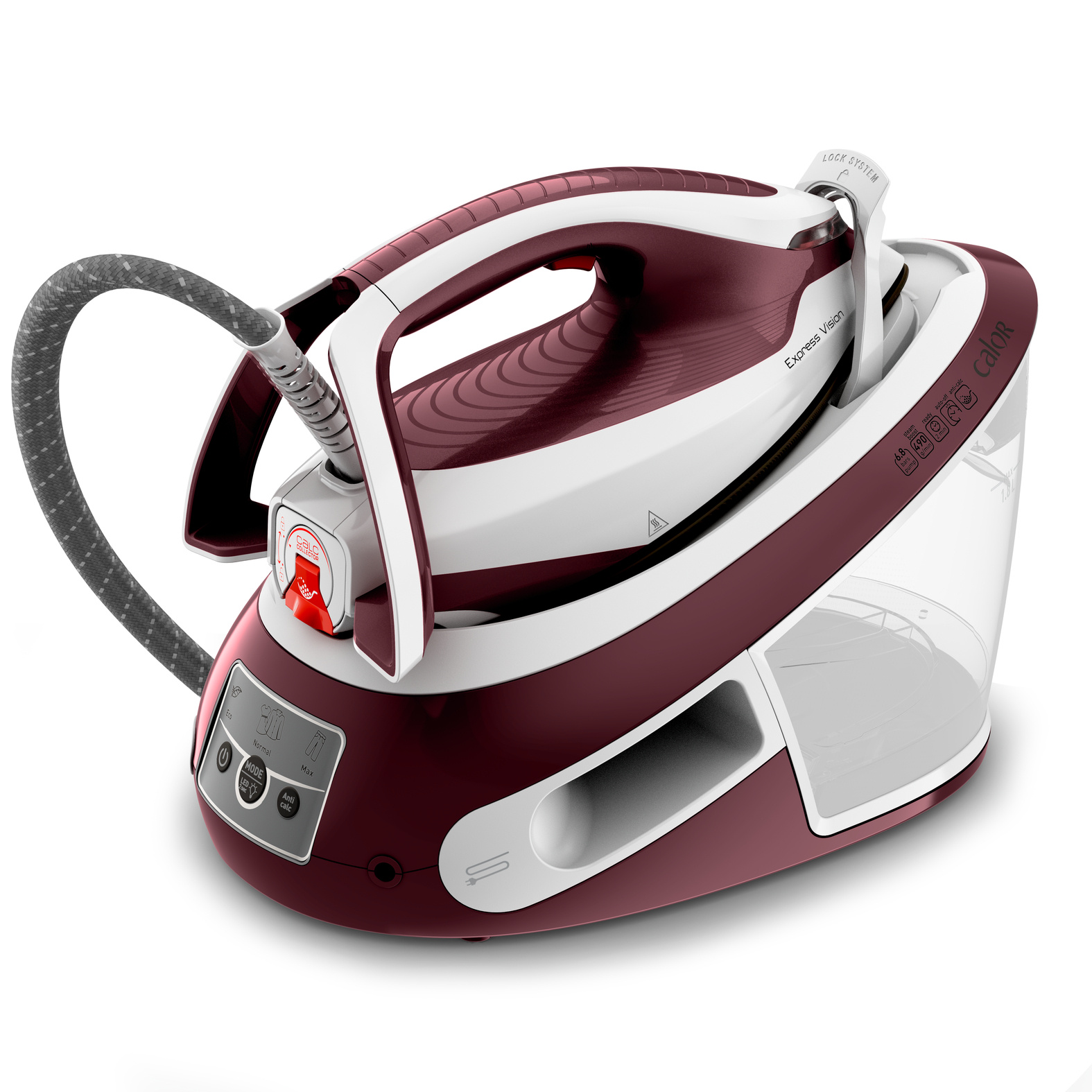 La centrale vapeur très puissante a un entretien facile pour des performances qui sont conçues pour durer. La centrale vapeur Calor Express Vision offre un ensemble complet pour une expérience de repassage des vêtements plus facile. La puissance de la vapeur, avec un débit de vapeur continu de 130 g/minute, une pression de pompe de 6,8 bars et une fonction pressing extra puissante de 490 g/minute pour venir à bout des plis les plus tenaces, est associée au système Easy LED Vision pour un repassage éclairé et des résultats parfaits. Le grand réservoir d'eau de 1,8 L est conçu pour offrir une autonomie maximale et réduire la fréquence des remplissages