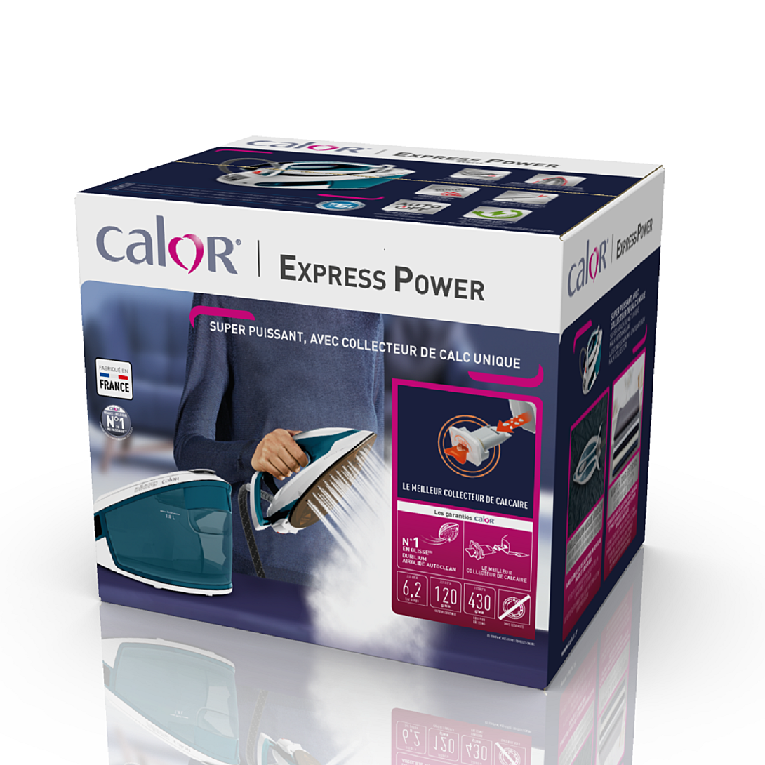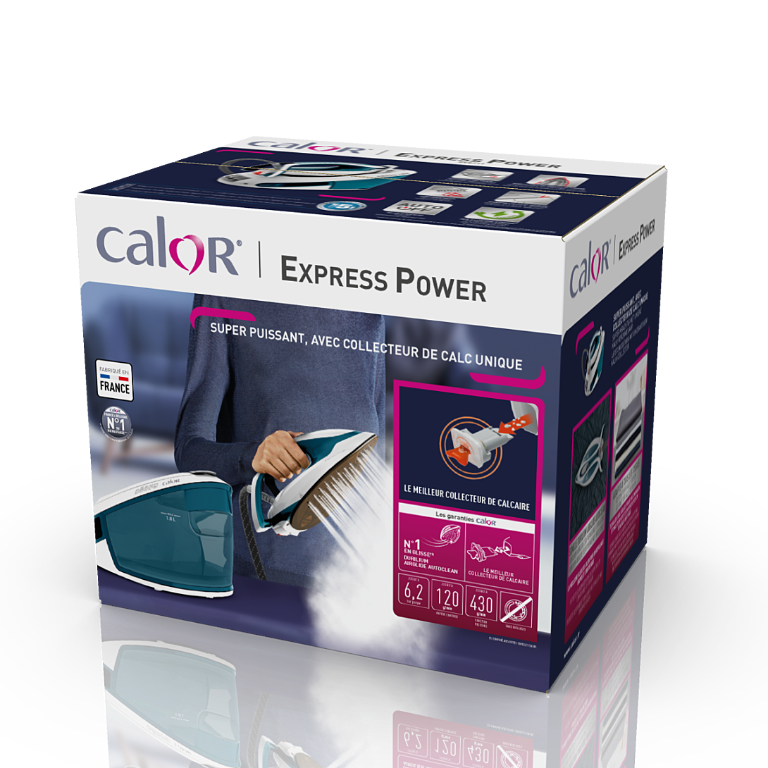 La centrale vapeur Calor Express Power permet d'entretenir facilement les vêtements en un rien de temps, en combinant des fonctions pratiques et une puissance de vapeur sans compromis. Son débit de vapeur continu de 120 g/min, une fonction pressing puissante de 430 g/min pour les plis tenaces et une pression de pompe de 6,2 bars vous permettent d'obtenir des résultats parfaits jour après jour. Découvrez des fonctionnalités améliorées pour faciliter l'entretien des vêtements : des résultats parfaits sur tous les tissus sans risque de brûlure, un collecteur de calcaire amovible, un réservoir d'eau à grande capacité et bien plus encore.