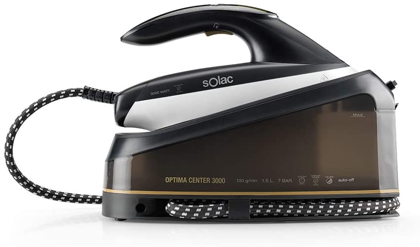 TECHNOLOGIE INTELLIGENTE ET SEMELLE EN CÉRAMIQUE : Une température unique qui s'adapte à tous les tissus pour un repassage parfait sans complications. Oubliez d'ajuster la température pour chaque vêtement et profitez d'un repassage plus facile, plus confortable et plus rapide grâce à la technologie intelligente. Technologie à deux positions pour réguler le débit de vapeur: ECO et MAX. Convient à tous les tissus. Centre de repassage avec semelle en céramique ultra-glissante et pointe de précision. Avec système anti-goutte.VAPEUR SUPER PRESSION AVEC CHARGE INFINITÉ : Centre de repassage équivalent à 7 bars de vapeur sous pression. Force et intensité maximales garanties avec la puissante poussée de vapeur électronique de 400 g / min et le débit de vapeur constant efficace de 130 g / min. Jusqu'à 3,65 m de rayon d'action. Réservoir de 1,5 l avec système de charge à l'infini, rechargeable sans déconnecter le centre de repassage. Vapeur antibactérienne qui élimine 99% des bactéries. Vêtements entièrement aseptisés et inodores.DÉMARRAGE RAPIDE ET ARRÊT AUTOMATIQUE : 3000 W de puissance qui garantissent un repassage rapide et efficace, sans attendre. Prêt à l'emploi en seulement 30 secondes. Déconnexion automatique après 7 minutes sans utilisation pour des économies d'énergie et une sécurité supplémentaire.SYSTÈME DE SERRURE : Système de transport et de verrouillage breveté de Solac. Vous pouvez fixer le fer à repasser à la chaudière et transporter confortablement le centre de repassage. Dispose d'un espace pour ranger le câble.ENTRETIEN OPTIMAL : Système d'autonettoyage électronique Calc & Clean. Il élimine le calcaire en garantissant une performance parfaite jour après jour. Produit avec 2 ans de garantie.