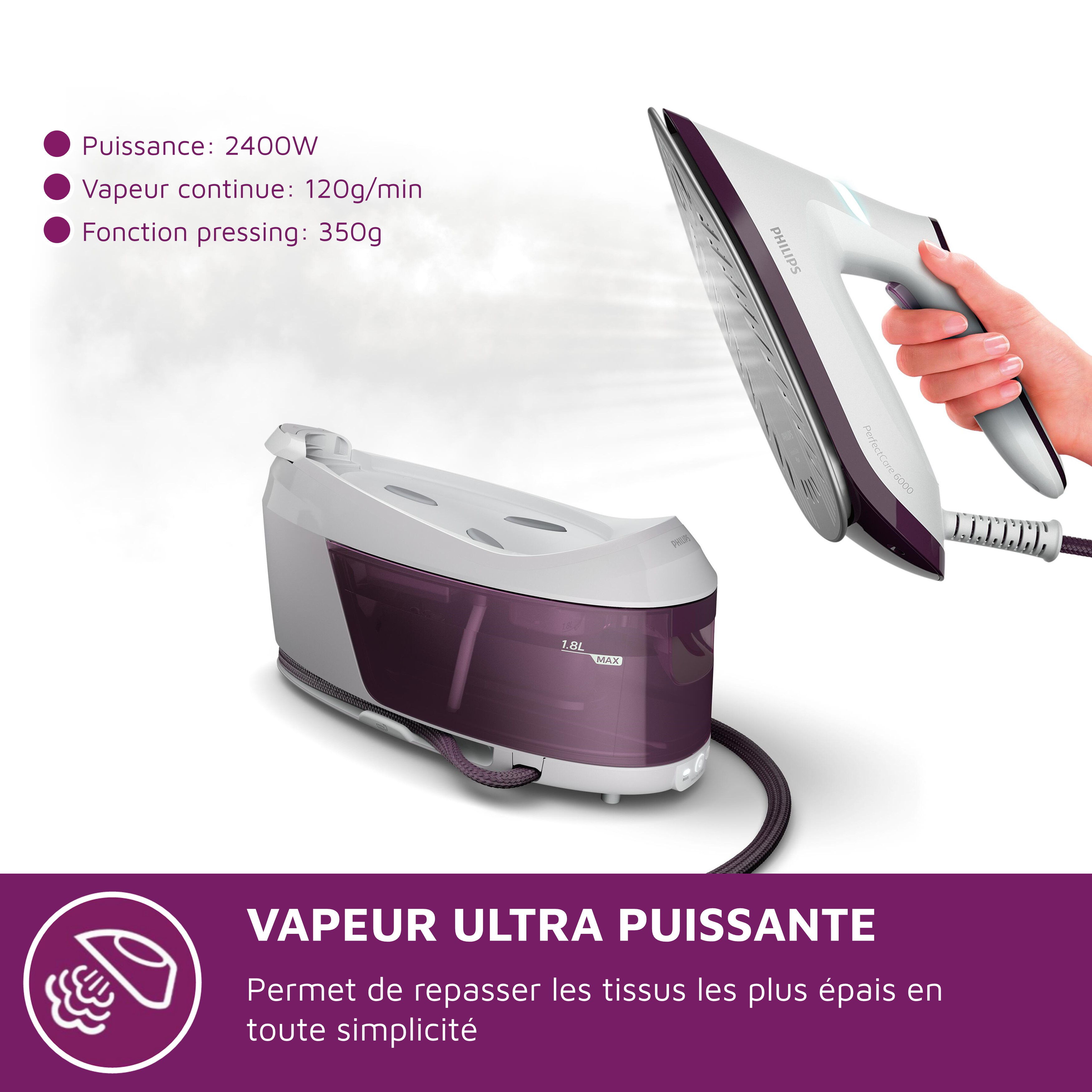| Libellé | Centrale Vapeur Philips PSG6020/30 Série 6000 Mauve/Blanc 1.8L |