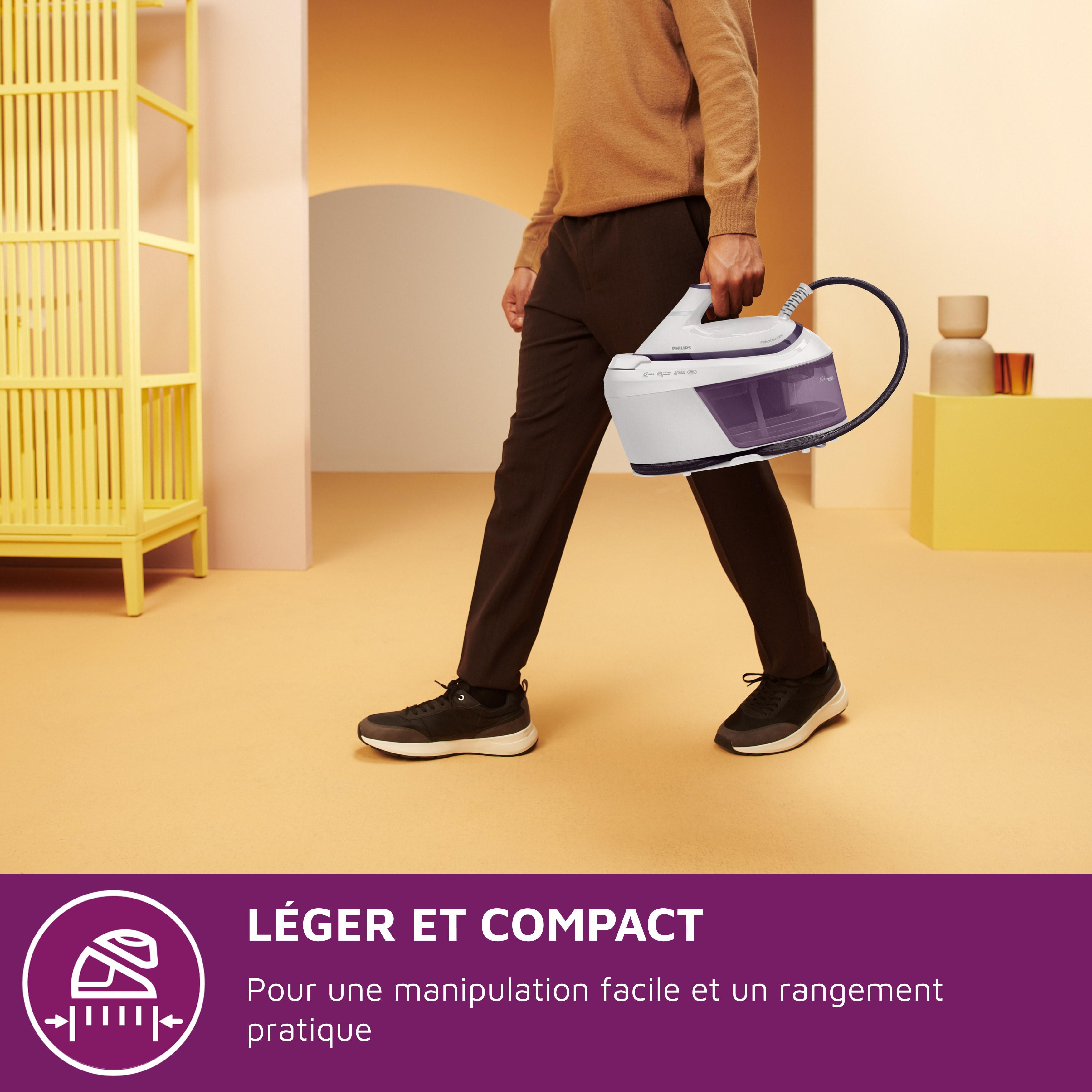 De plus, sa conception compacte et son poids plume de seulement 2,7kg (fer à repasser vapeur + base) rendent cette centrale vapeur extrêmement maniable et facile à ranger.