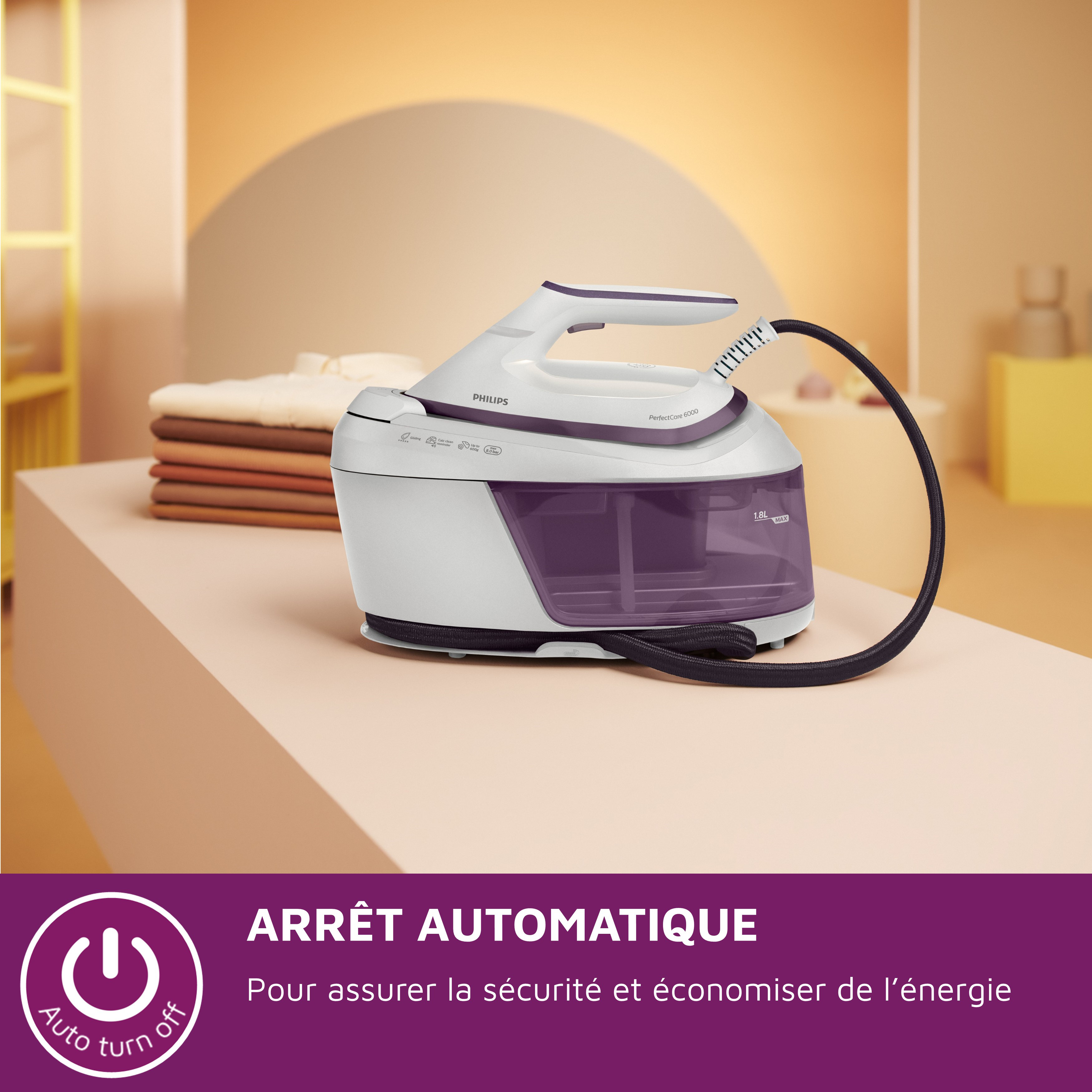 La centrale vapeur est équipée d'un arrêt automatique pour économiser de l'énergie et pour plus de tranquillité d'esprit.