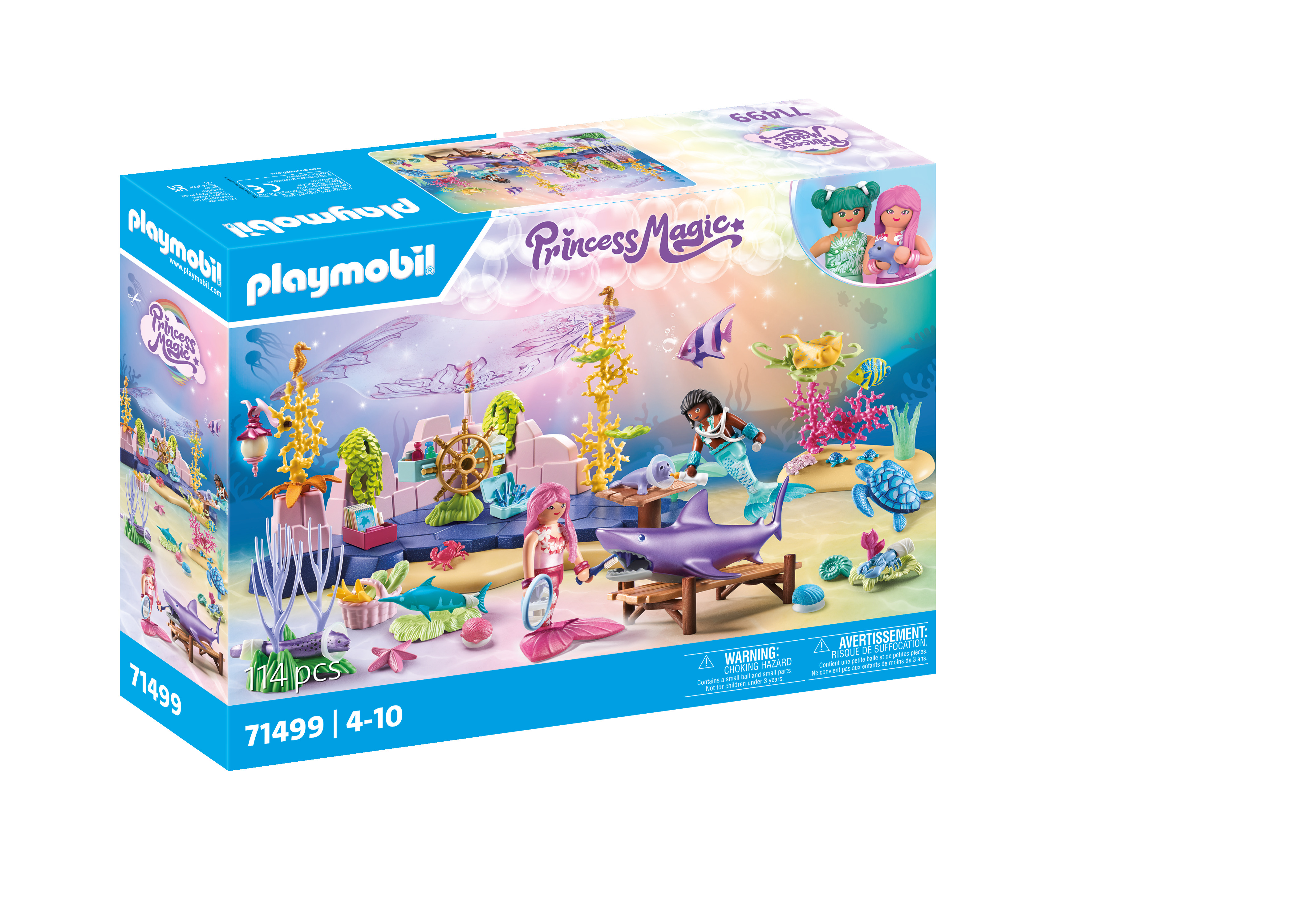 Bienvenue dans le monde coloré des sirènes ! Comprend deux personnages, des coquillages qui se fixent par effet ventouse, des poissons, un requin, le centre de soin et un bébé otarie. Dimensions : 24 x 24 x 16 cm (LxPxH)
