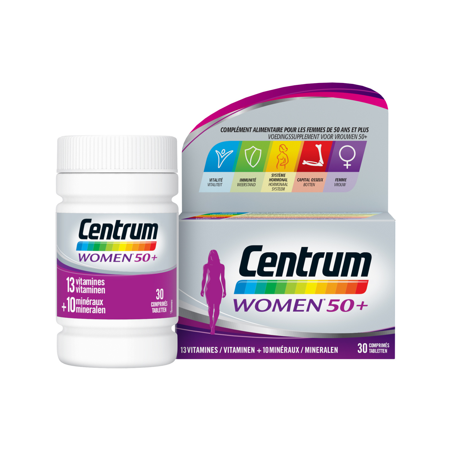 Centrum Women 50+ est un complexe multivitaminé unique scientifiquement adapté aux besoins spécifiques des femmes passées 50 ans. Il leur apporte tout ce dont leur corps a besoin pour rester en forme au quotidien. Ce complément Alimentaiire pour les Femmes de 50 Ans et plus est une association unique et complète de 13 vitamines et 10 minéraux, spécialement adaptés aux besoins nutritionnels des femmes de plus de 50 ans : Vitalité : Du fer, des vitamines du groupe B et du magnésium qui contribuent à réduire la fatigue. Immunité : Des anti-oxydants qui contribuent au fonctionnement normal du système immunitaire. Système Hormonal: De la vitamine B6 qui contribue à la régulation de l’activité hormonale. Capital Osseux : Du calcium et des vitamines D et K pour le maintien des os solides.