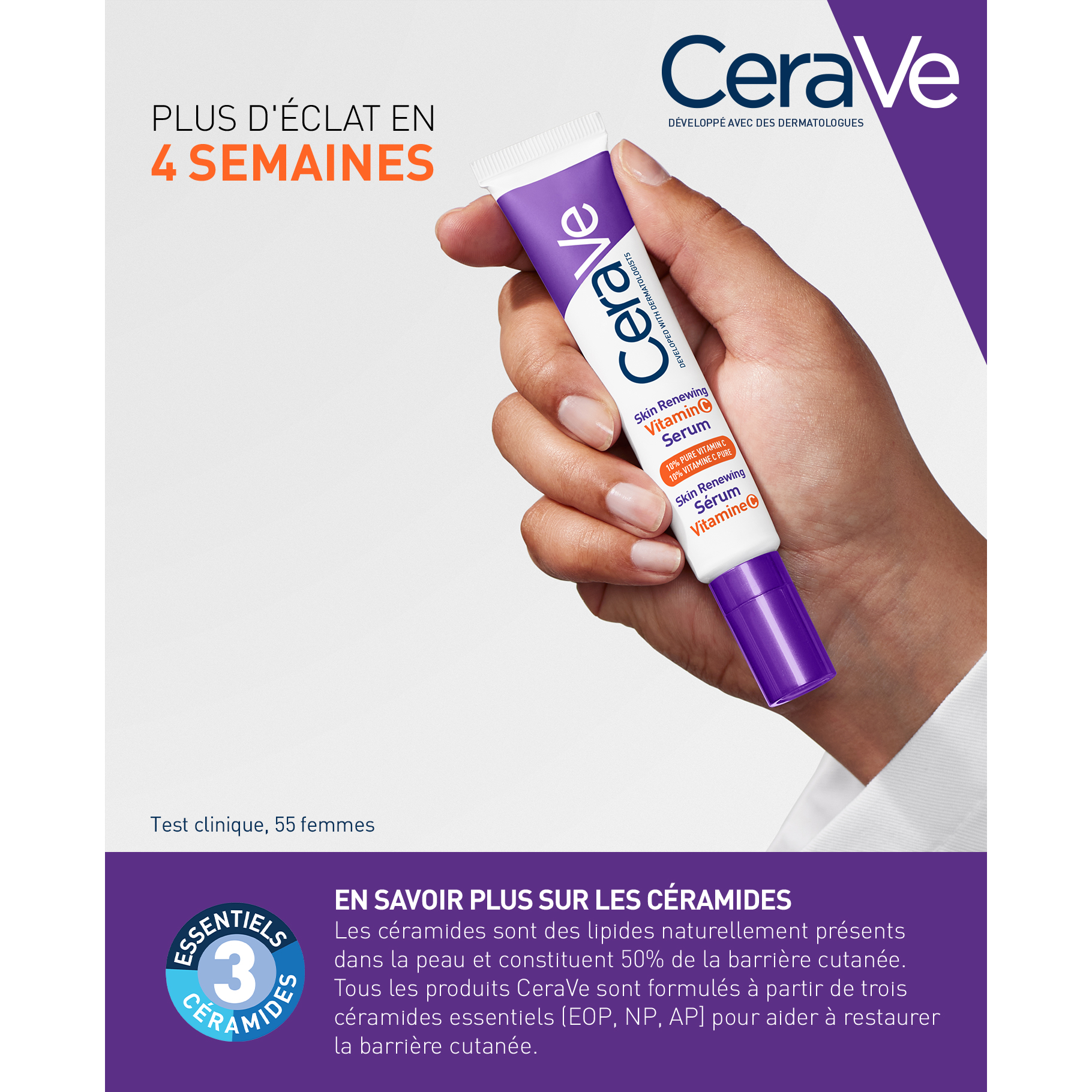 Développé avec des dermatologues, Skin Renewing Sérum Vitamine C est conçu pour les premiers signes de l'âge. Il est formulé avec 10 % de vitamine C pure antioxydante, 3 céramides essentiels identiques à ceux de la peau et la technologie MVE. Il booste l’éclat du teint, hydrate pendant 24 heures et restaure la barrière cutanée. Ce sérum-gel à la texture légère, non gras et non collant, à absorption rapide, offre une peau est visiblement plus éclatante en 4 semaines*. Convient pour tous types de peaux, mêmes les plus sensibles. *Test clinique sur 55 femmes âgées de 18 à 65 ans. 7 femmes sur 10 constatent une peau visiblement plus éclatante. 90% des consommateurs déclarent avoir une peau plus lisse et plus douce au toucher. 90% des consommatrices s'accordent à dire que ce sérum à absorption rapide est léger et doux pour la peau, et qu'il n'est pas gras. Offre une peau plus éclatante, plus lisse, plus douce, d'apparence plus saine et fraiche, avec rides et ridules atténuées.* Plus d'écl