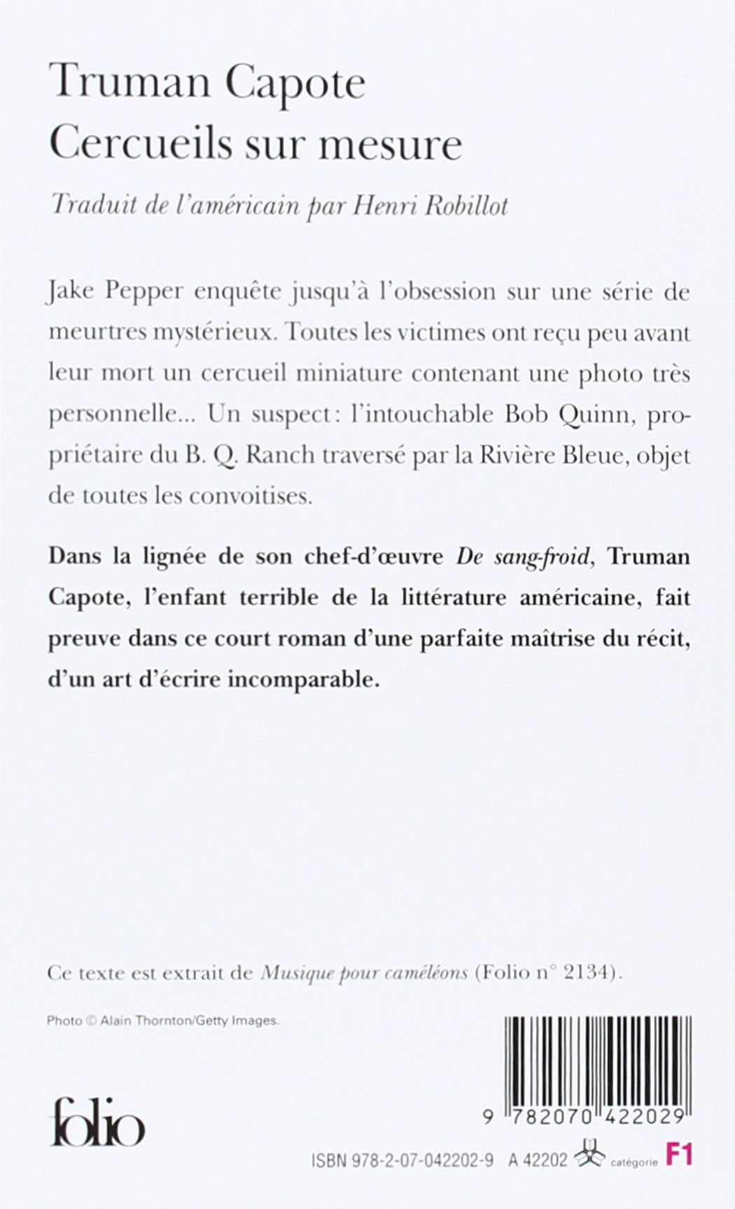 Jake Pepper enquête jusqu'à l'obsession sur une série de meurtres mystérieux. Toutes les victimes ont reçu peu avant leur mort un cercueil miniature contenant une photo très personnelle... Un suspect : l'intouchable Bob Quinn, propriétaire du B.Q. Ranch traversé par la Rivière Bleue, objet de toutes les convoitises. Dans la lignée deson chef-d'oeuvre De sang-froid, Truman Capote, l'enfant terrible de la littérature américaine, fait preuve dans ce court roman d'une parfaite maîtrise du récit, d'un art d'écrire incomparable.