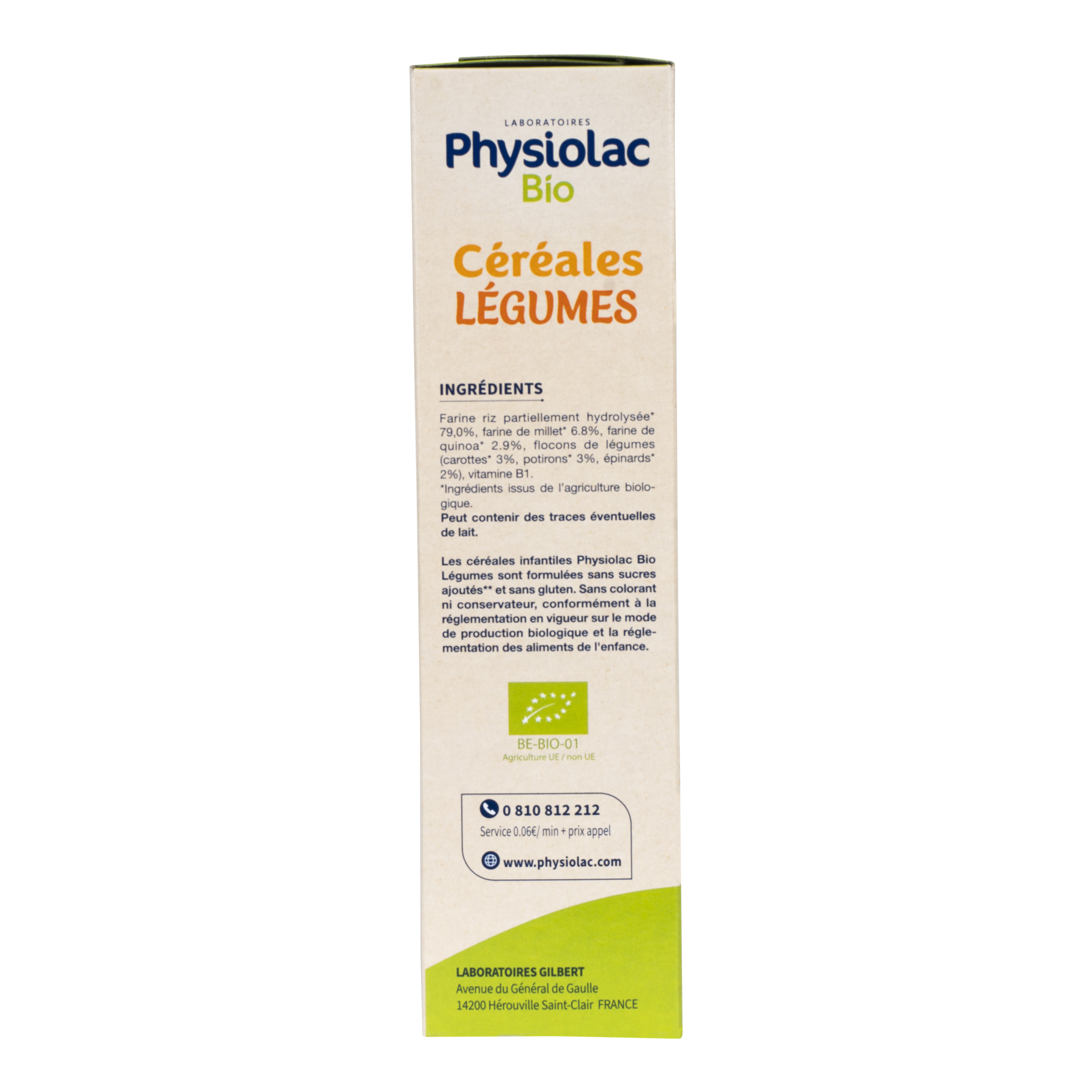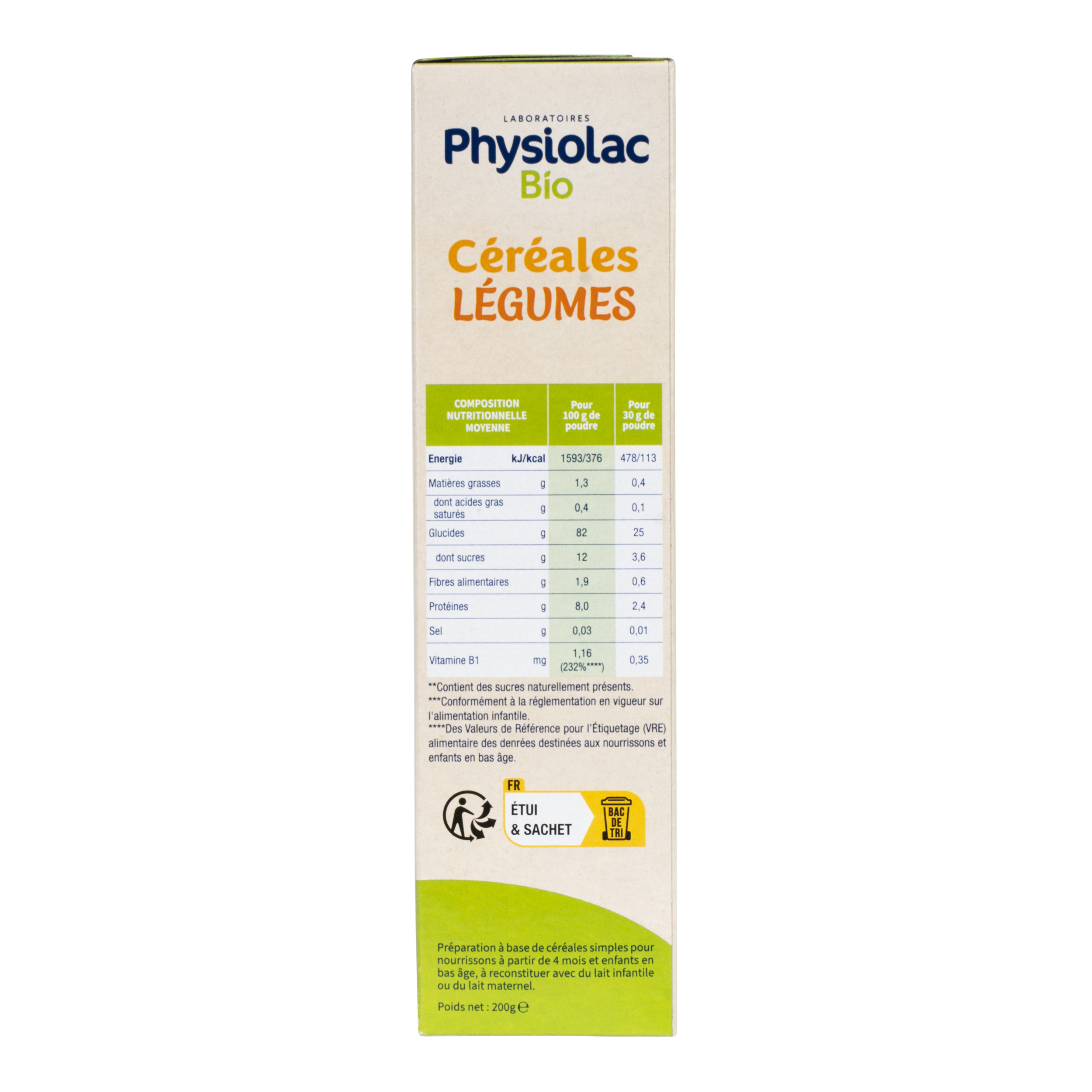 Physiolac Bio Céréales Légumes Dès 4 Mois 200 g est une préparation à base de céréales simples pour nourrissons à partir de 4 mois et enfants en bas âge. Ces céréales instantanées ne nécessitent aucune cuisson, elles sont conseillées chez le nourrisson à partir de 4 mois lorsqu'il : - est lassé du lait infantile et refuse le biberon de lait nature, - débute la diversification alimentaire, - a besoin d'un biberon avec ajout de céréales et de légumes pour le soir. Elles sont constituées de farine de céréales Bio : Riz, Millet et Quinoa. Ces 3 sources de glucides permettent de débuter la diversification alimentaire tout en douceur. La formule est complétée par du potiron, de la carotte et de l'épinard. Ces céréales infantiles sont formulées sans blé, sans orge, sans avoine, sans seigle. Sans colorant ni conservateur conformément à la réglementation en vigueur sur le mode de production biologique et la réglementation des aliments de l'enfance. Peut contenir des traces éventuelles de lait.