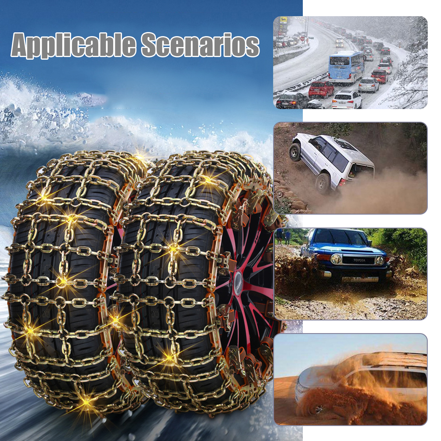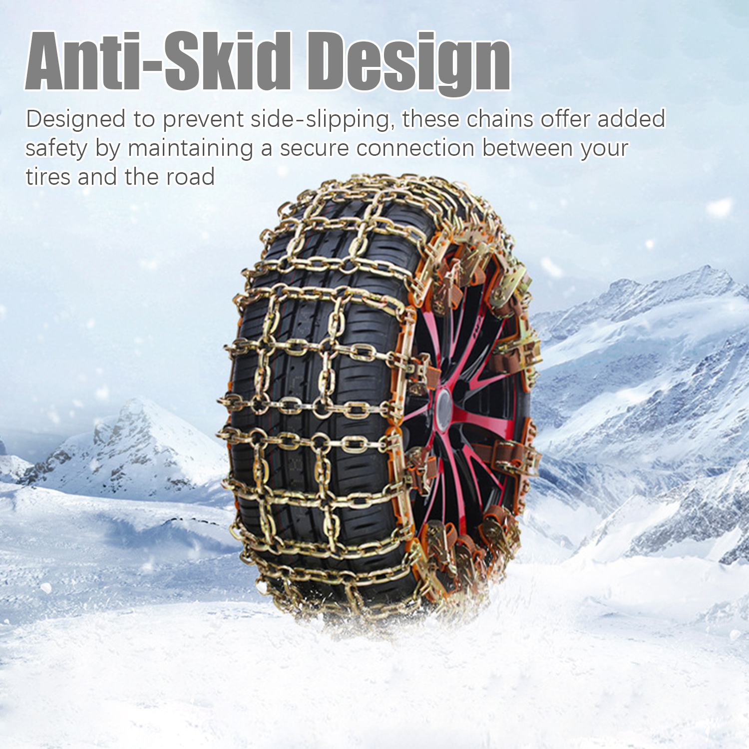 Passer le carrousel d'imagesAjustement universel : La chaîne à neige s'adapte à différents types de voitures et de pneus de voiture. Elle offrent une traction et une stabilité améliorées sur les routes enneigées et verglacées.