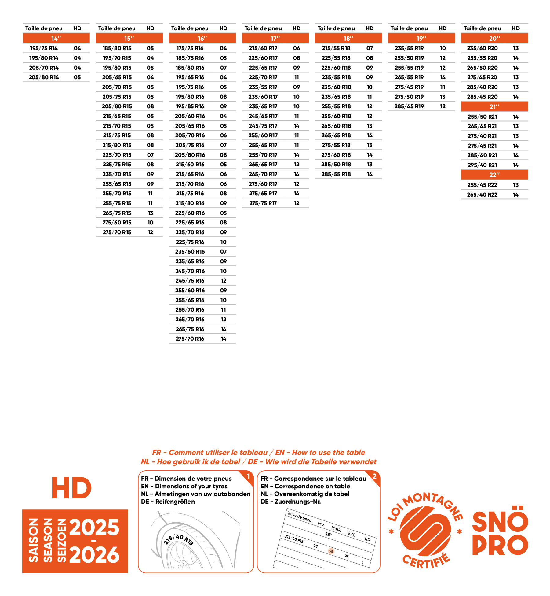Libellé Chaines neige 12mm HD07 - automatique - 225 70 R15, 185 80 R16, 205 75 R16, 235 60 R16, 215 55 R18,