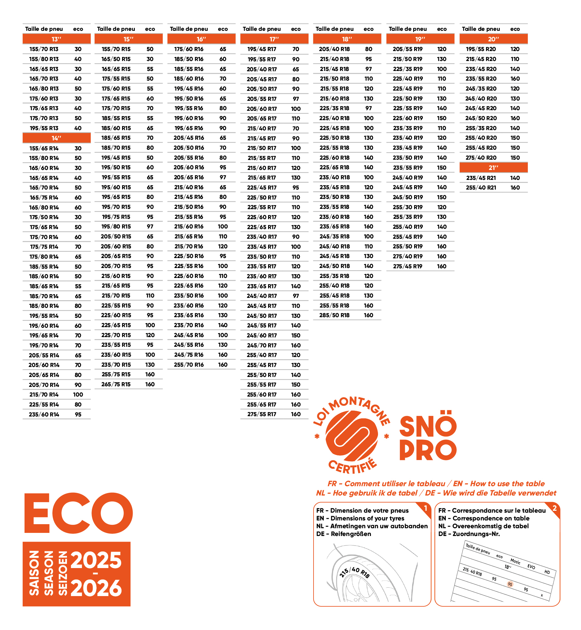 | Libellé | Chaines neige 9mm ECO 120 - 215 60 R17, 255 40 R18, 235 40 R19, 195 55 R20 et + |