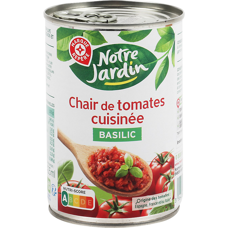 Ingrédients : Pulpe de tomates 83,3 %, purée de tomates triple concentrée 8 %, oignons 4 %, huile de tournesol, sel, amidon modifié de maïs, sucre, plantes aromatiques (dont basilic déshydraté 0,16 %), poivre, arôme naturel de basilic, acidifiant : acide citrique.