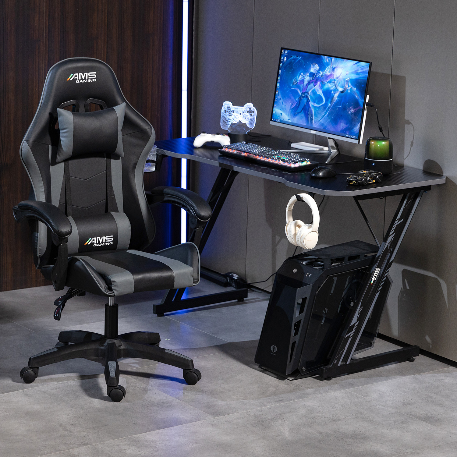 Chaise AMS-GAMING GAMER#02-GREY coloris noir & gris - coussin lombaire & appuie tête - Siège gaming
