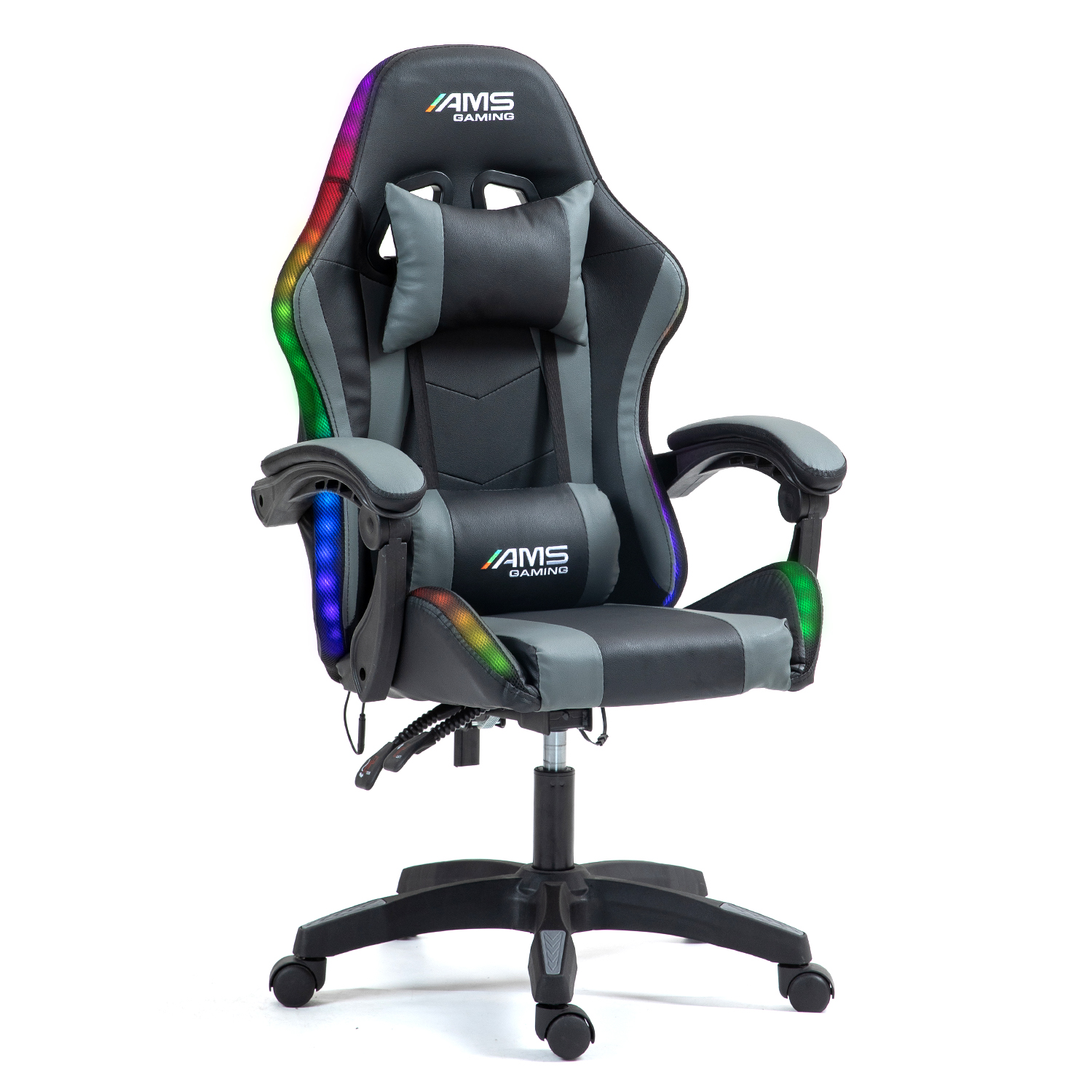 | Libellé | Chaise AMS-GAMING GAMER#02-GREY-LED - coloris noir & gris - LED RGB 358 effets - Télécomande - Coussins lombaire & appuie-tête |