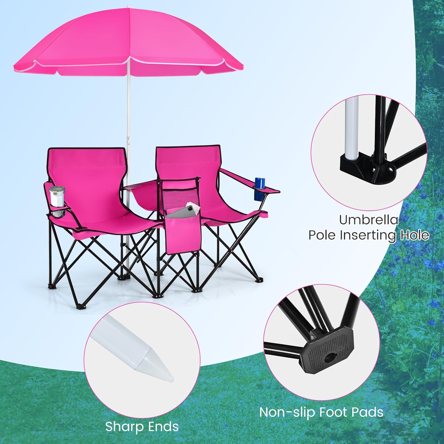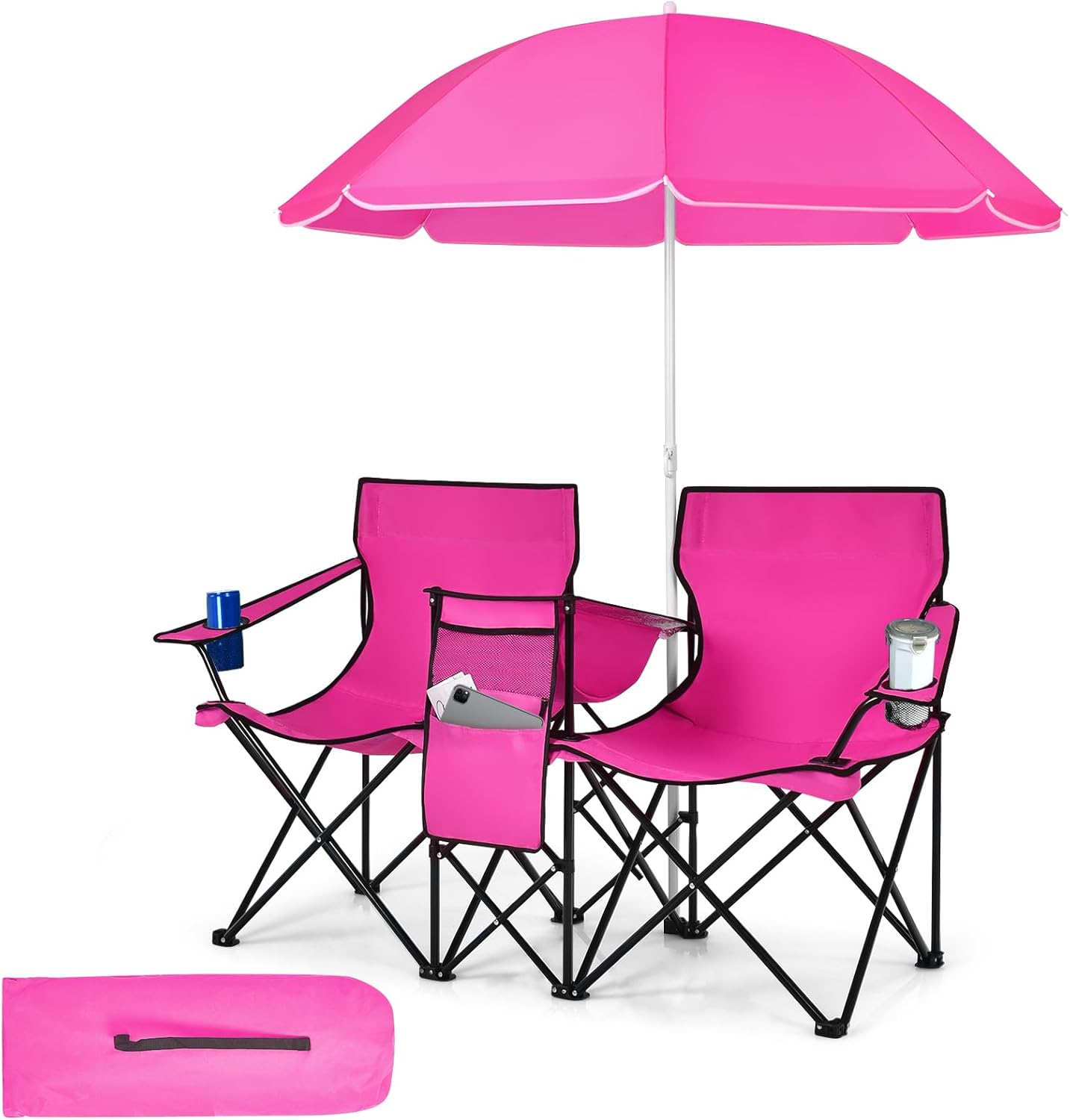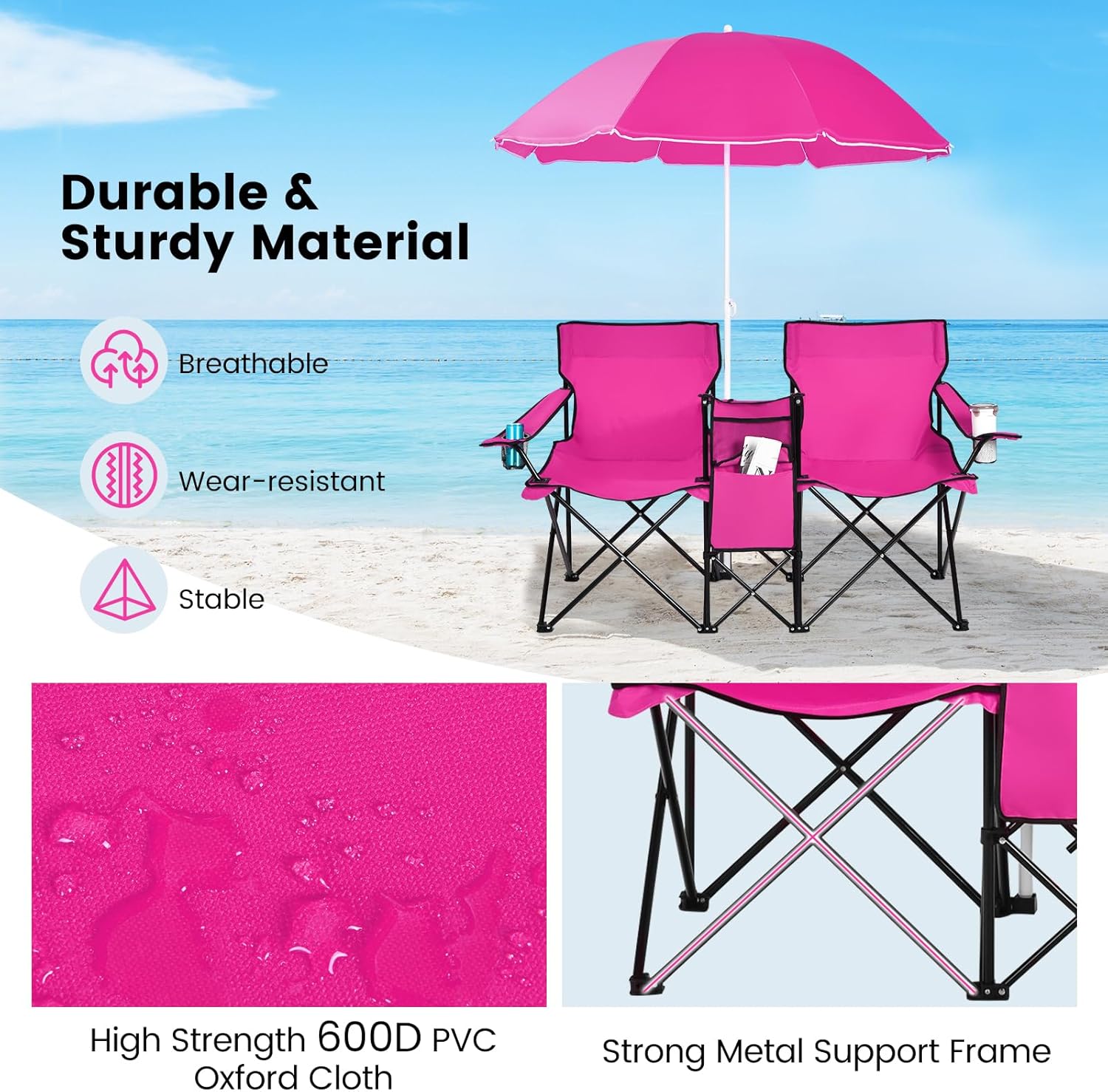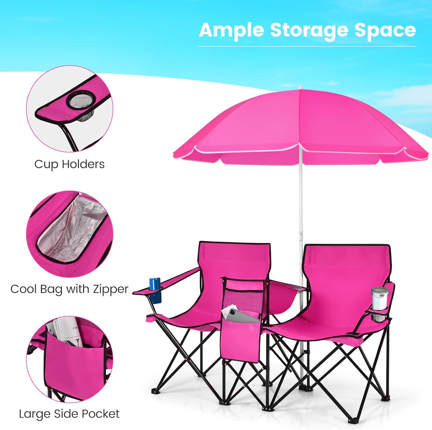 Chaise camping pliante pour 2 personnes, fauteuil camping avec parasol, porte-gobelet, sac isotherme,rose