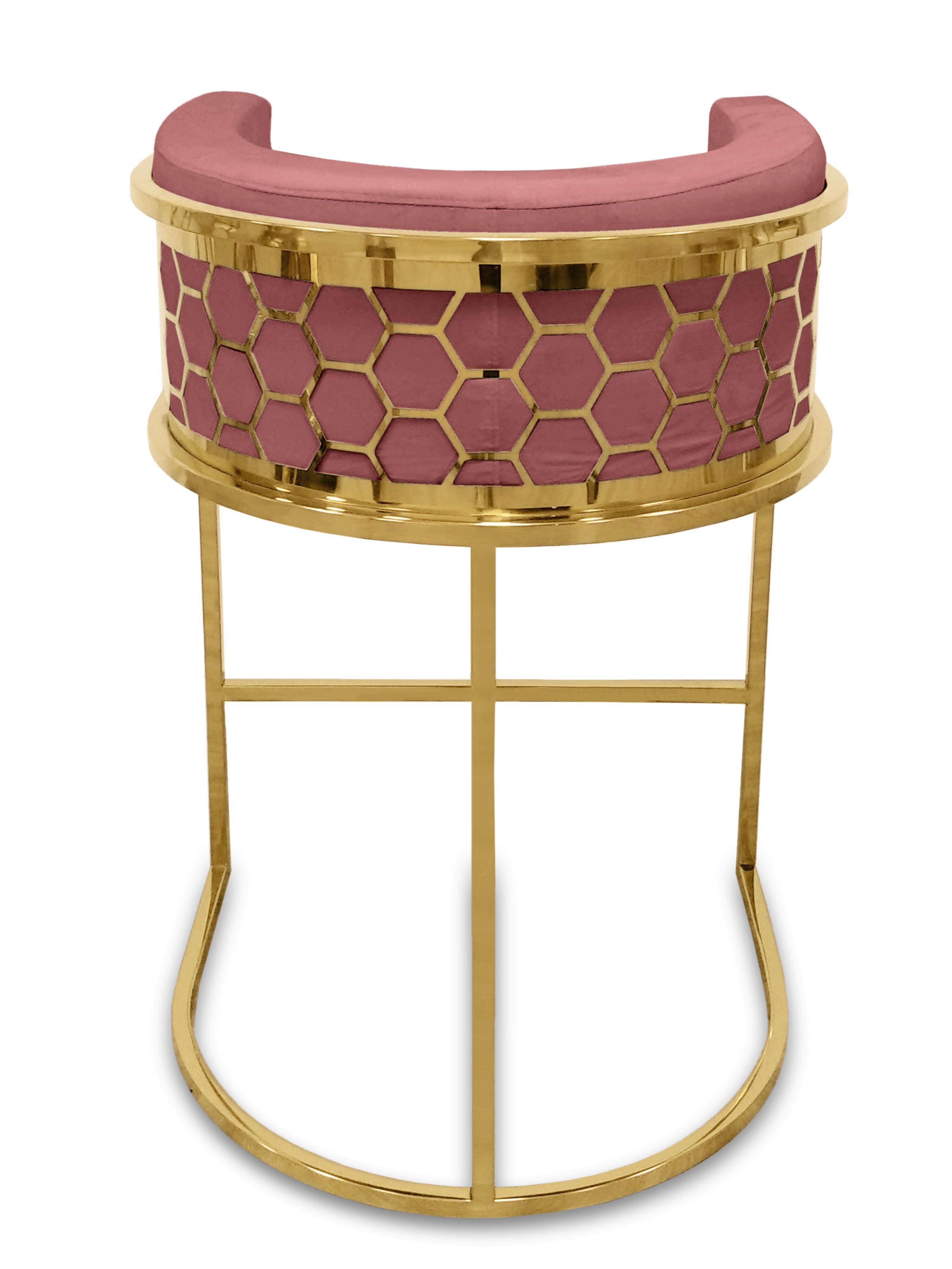 La chaise de bar HONEY est une chaise de bar au revêtement de velours très confortable et à la structure originale, avec sa forme arrondie en métal doré effet nid d abeille.