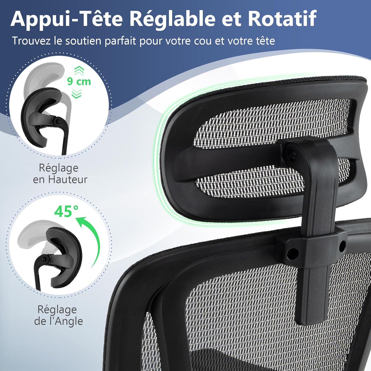Appuie-tête réglable et rotatif pour un meilleur soutien de votre tête et de votre cou