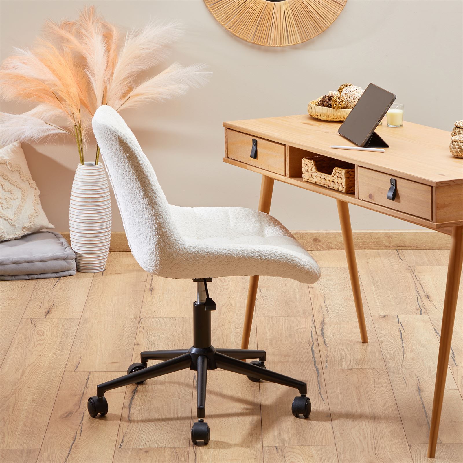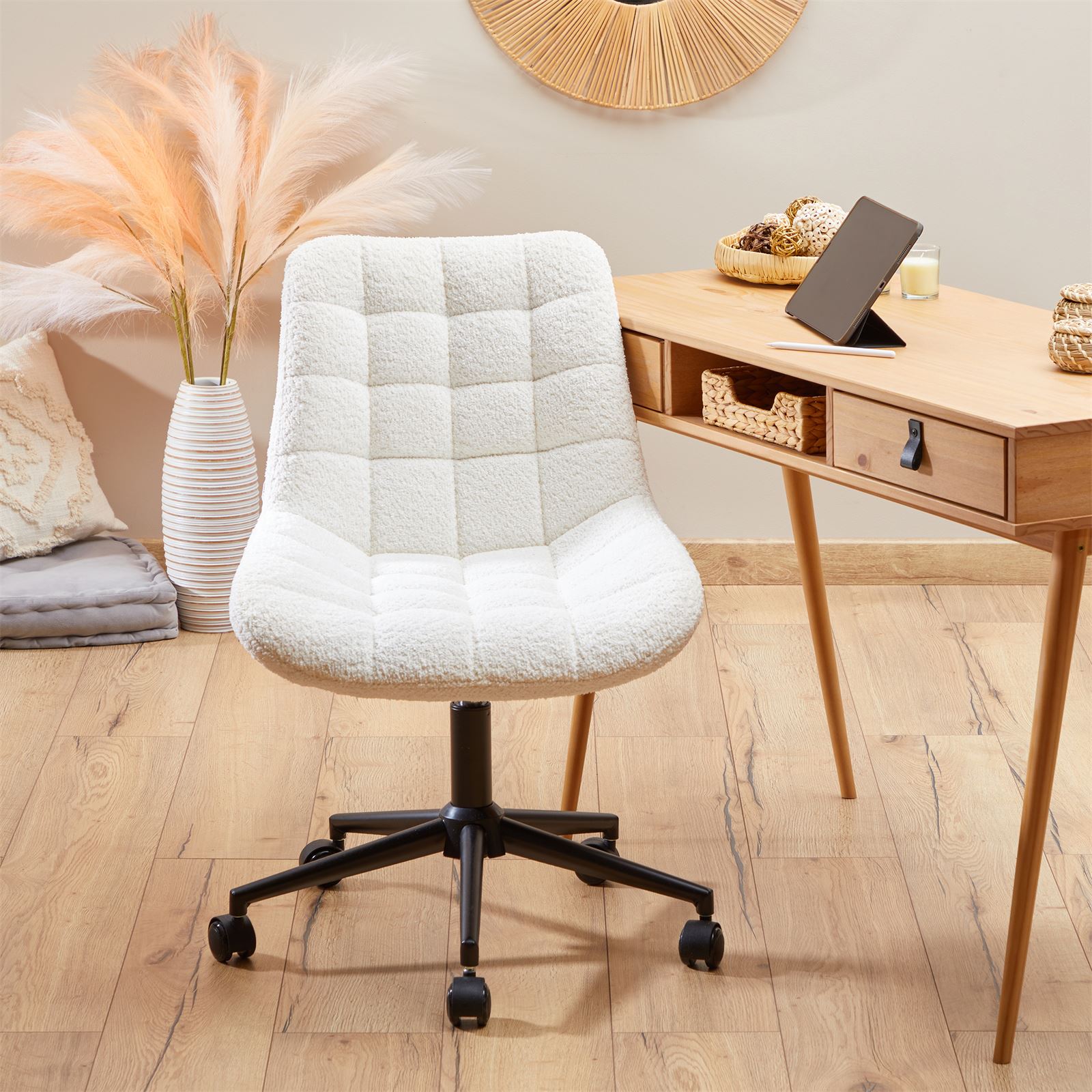 - Le dossier et l'assise de cette chaise de bureau sont recouverts d'un revêtement en tissu bouclé "pilou" de coloris blanc.