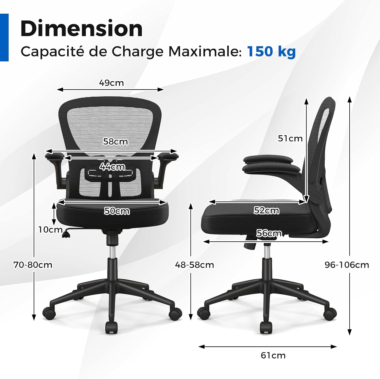 | Libellé | Chaise de Bureau Ergonomique, Chaise Pivotante avec Accoudoirs Escamotables, Dossier Basculant de 90° à 120°, pour Bureau, Chambre, Noir |