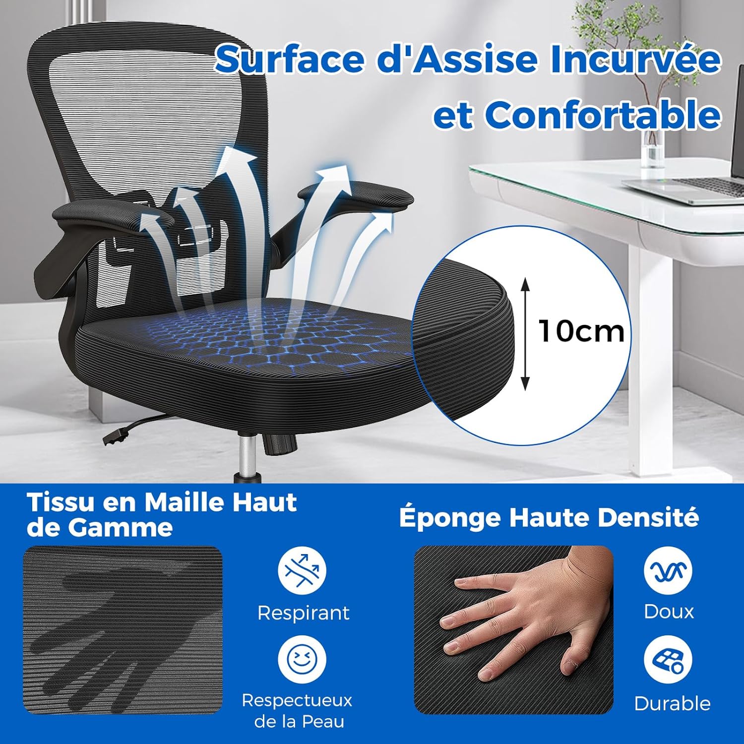 ----【Tissu en Maille Confortable et Éponge】La chaise de bureau combine un tissu en maille respirant et une éponge élastique pour offrir un confort optimal. De plus, l'épaisseur du siège incurvé atteint 10 cm, ce qui vous évite de vous fatiguer lors de longues réunions.