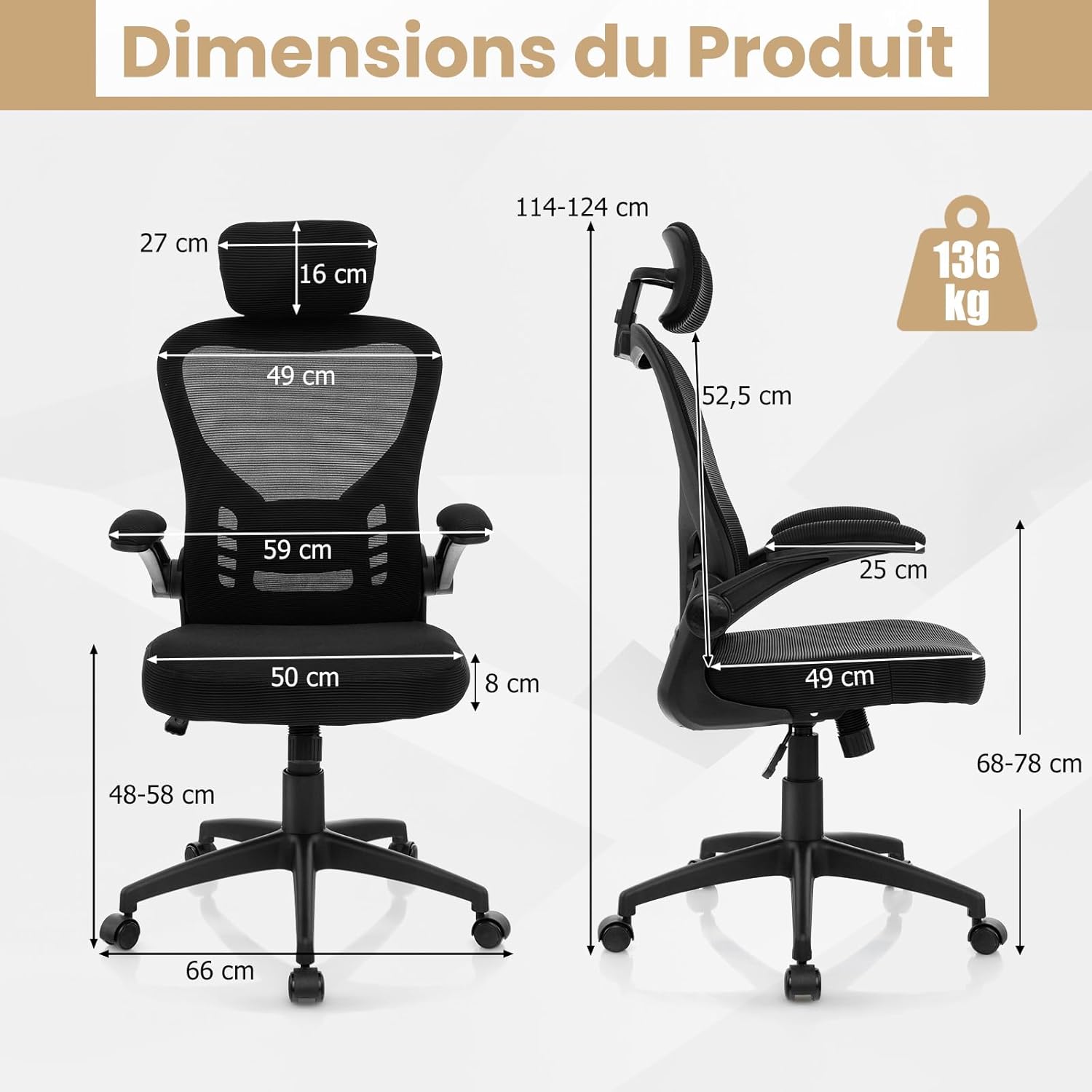 | Libellé | Chaise de Bureau Ergonomique en Maille, Chaise Pivotante avec Support Lombaire et Appuie-tête Ajustable, Dossier Basculant, Noir |