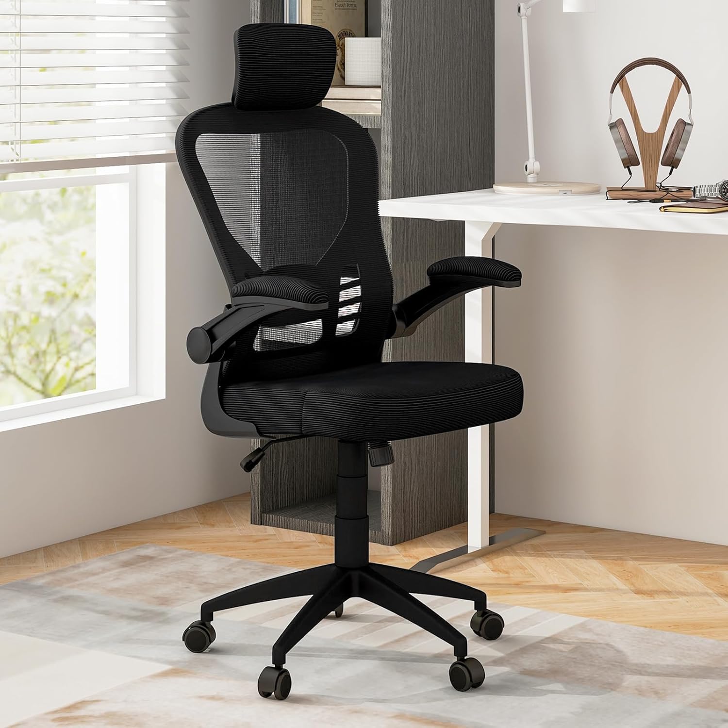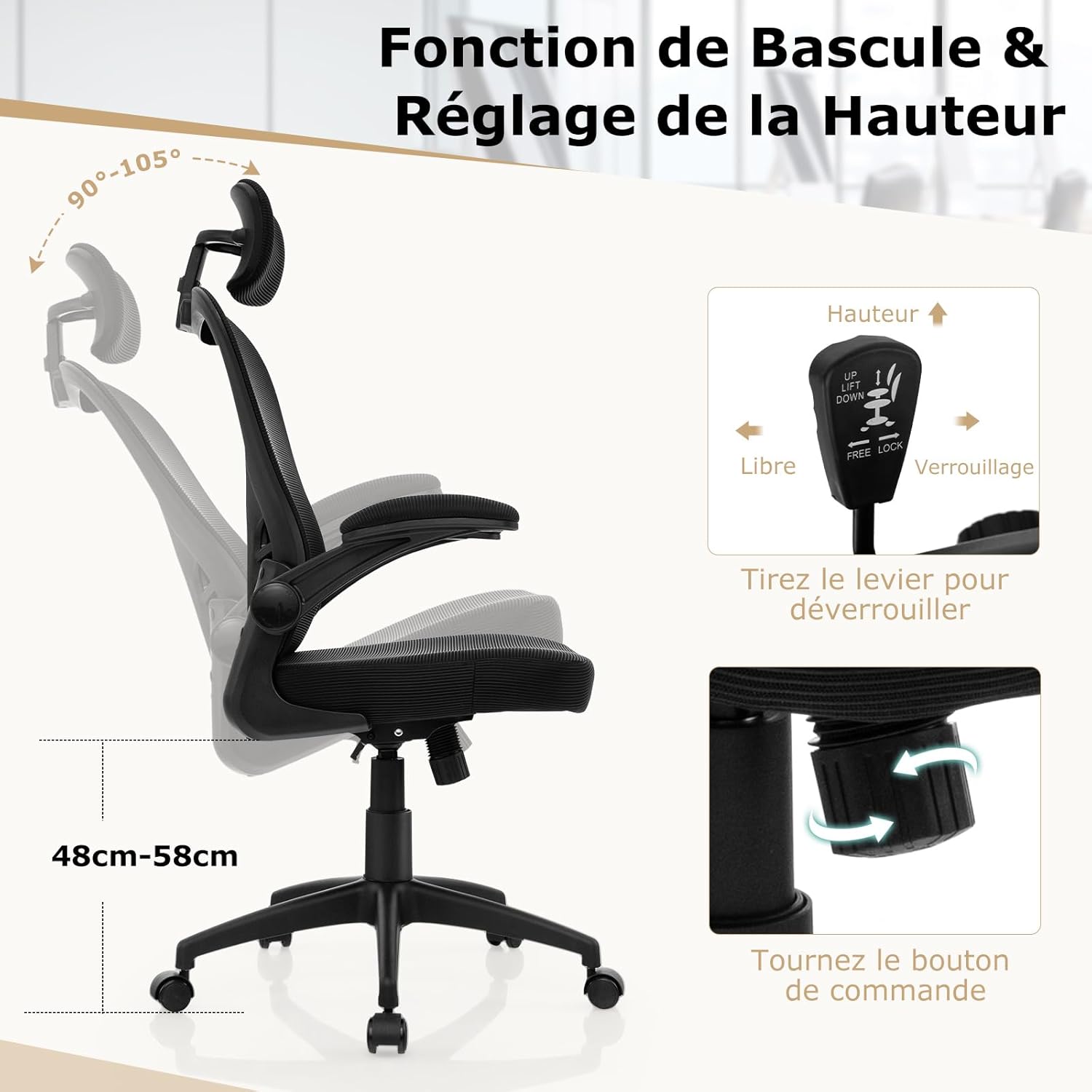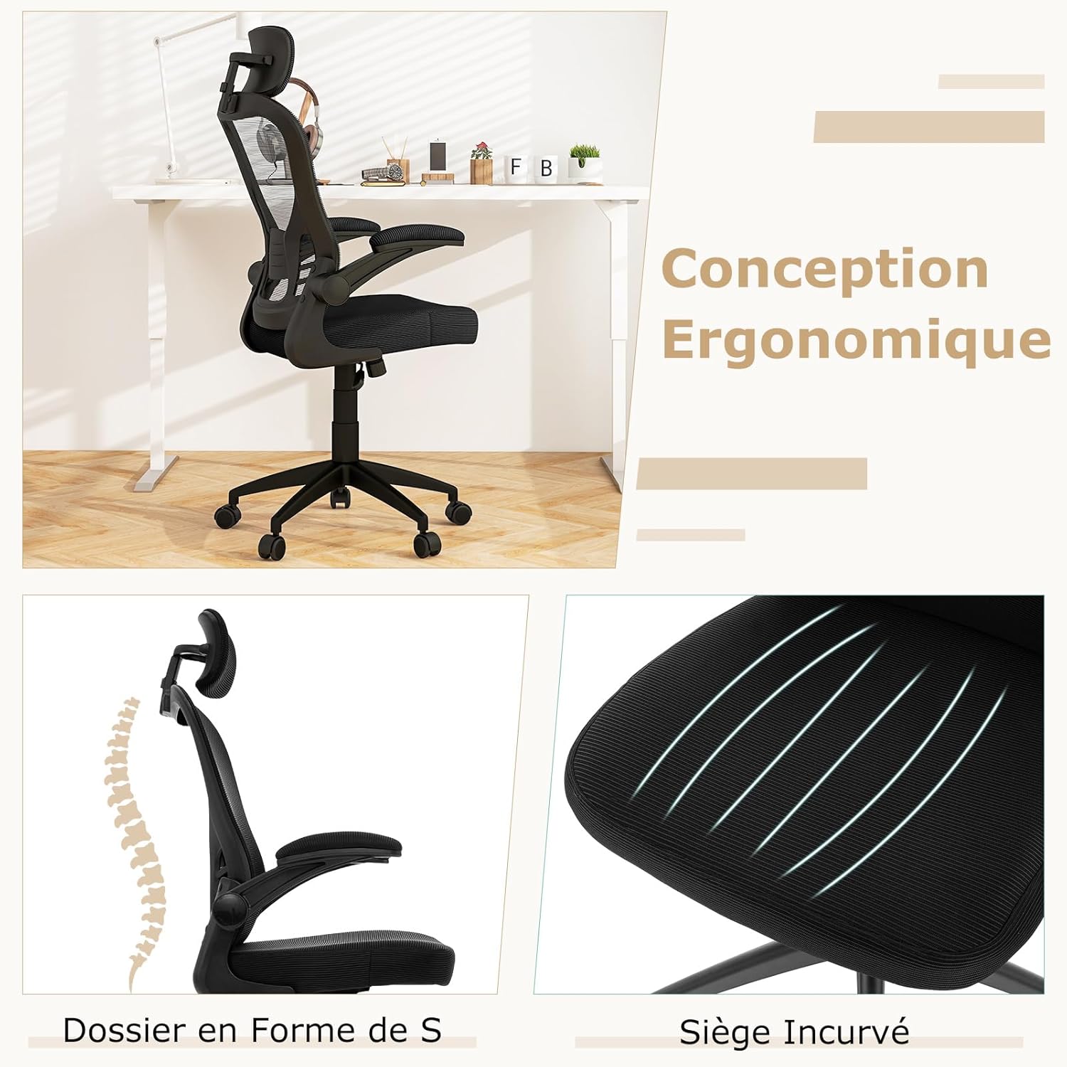 -----【Chaise Ergonomique avec Accoudoirs Rabattables】La chaise de bureau est équipée d'un dossier en forme de ‘S’, d'un siège incurvé et d'accoudoirs rembourrés pour offrir un confort à votre dos, vos hanches, vos bras et vos mains. De plus, vous pouvez relever les accoudoirs rembourrés pour un rangement peu encombrant lorsque vous ne l'utilisez pas.