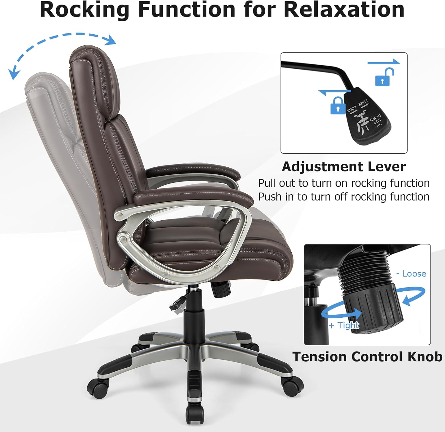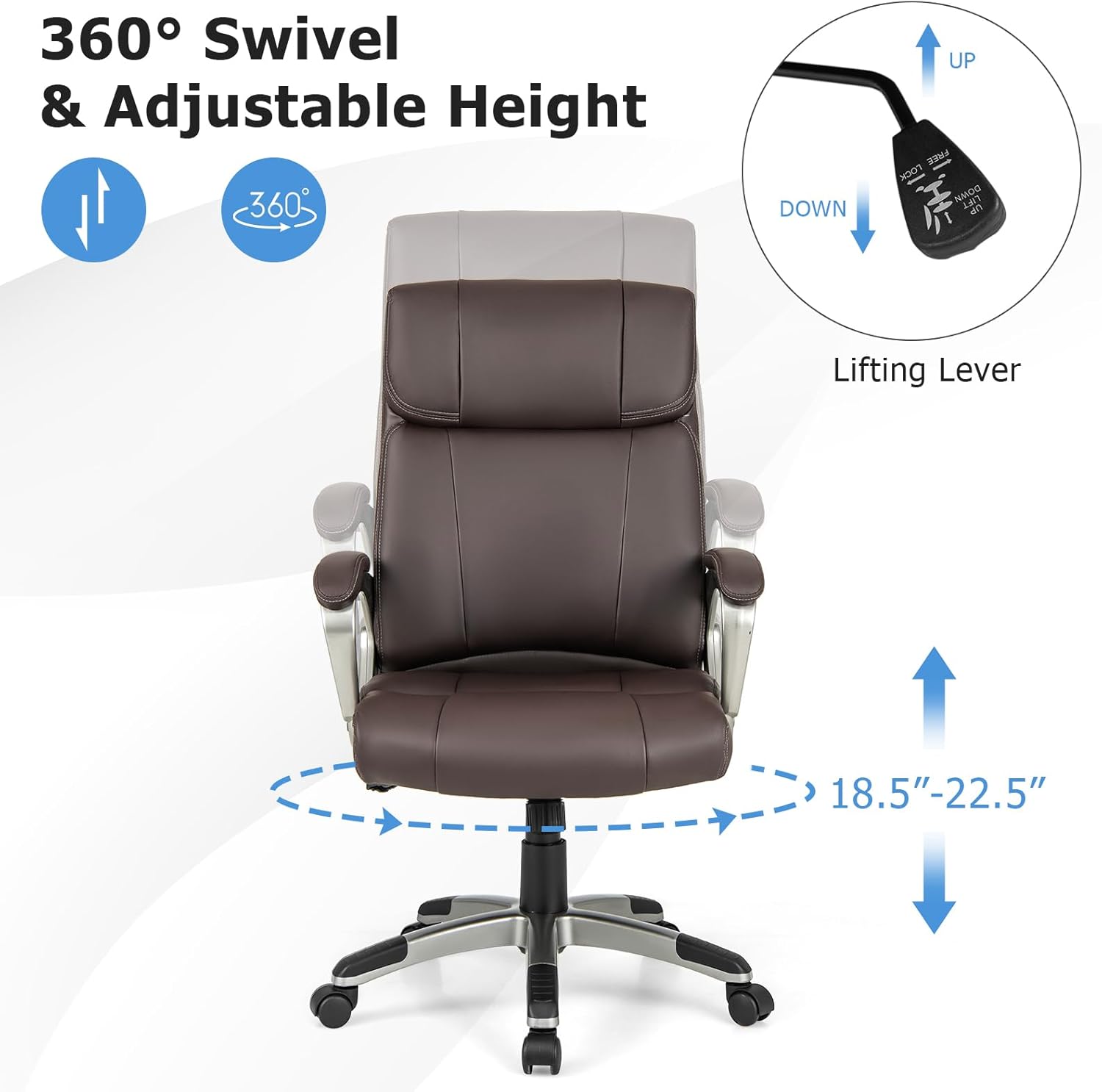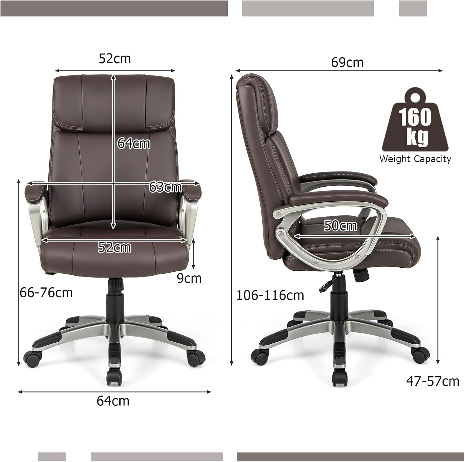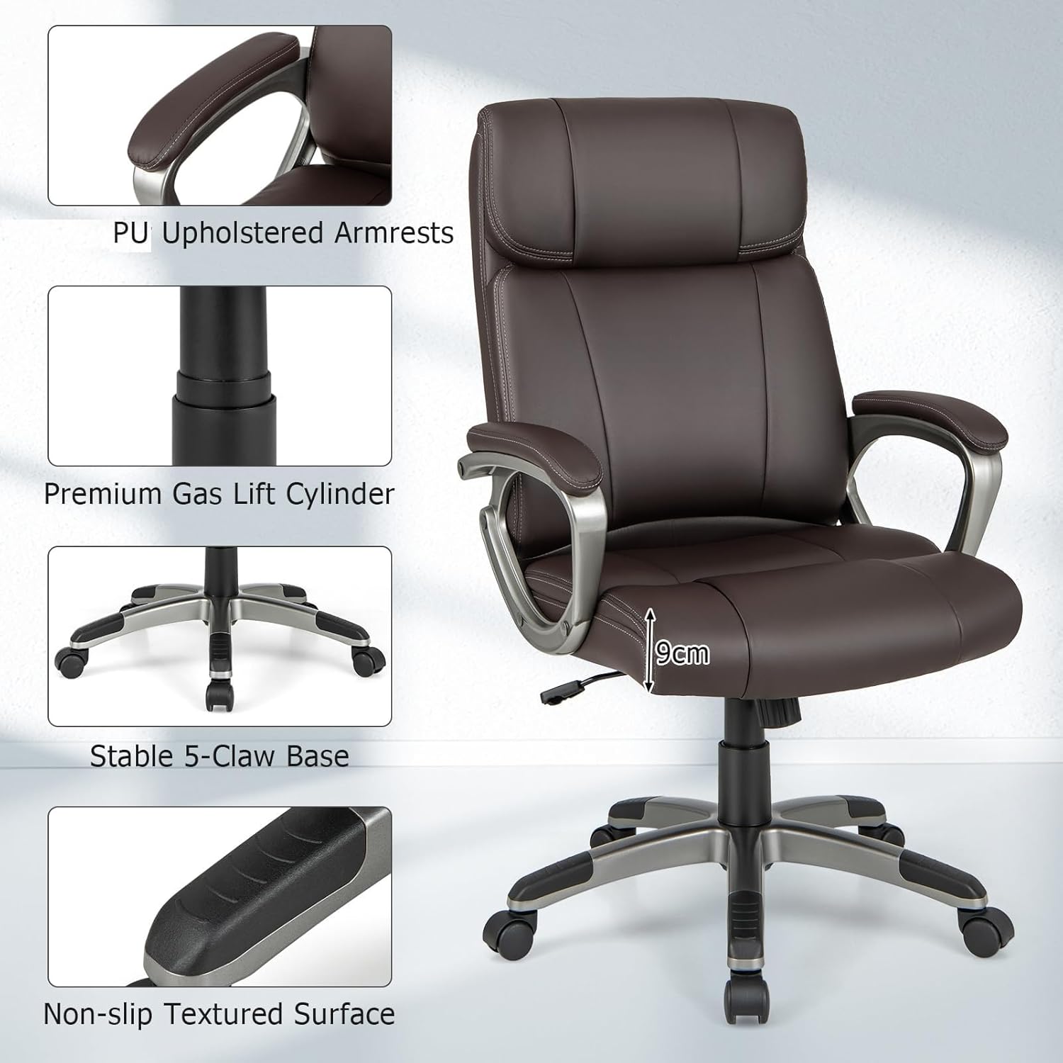 Notre chaise de bureau pivotante est le choix parfait pour votre travail quotidien. Le dossier ergonomique et les accoudoirs s'adaptent parfaitement aux courbes de votre corps, de sorte que vous ne vous fatiguez pas même lors d'un apprentissage ou d'un travail prolongé. Cette chaise de bureau à dossier haut est fabriquée en polyuréthane résistant et lisse. Base en métal et pieds cinq étoiles pour plus de sécurité et de stabilité. Cinq roues pivotantes à 360 degrés permettent un mouvement facile, de sorte que vous pouvez facilement communiquer avec vos collègues et augmenter votre productivité. Il convient également de noter que vous pouvez ajuster la hauteur à votre taille et à vos besoins avec le levier d'air de qualité supérieure. Cette chaise est idéale pour le bureau, le bureau ou la chambre à coucher.