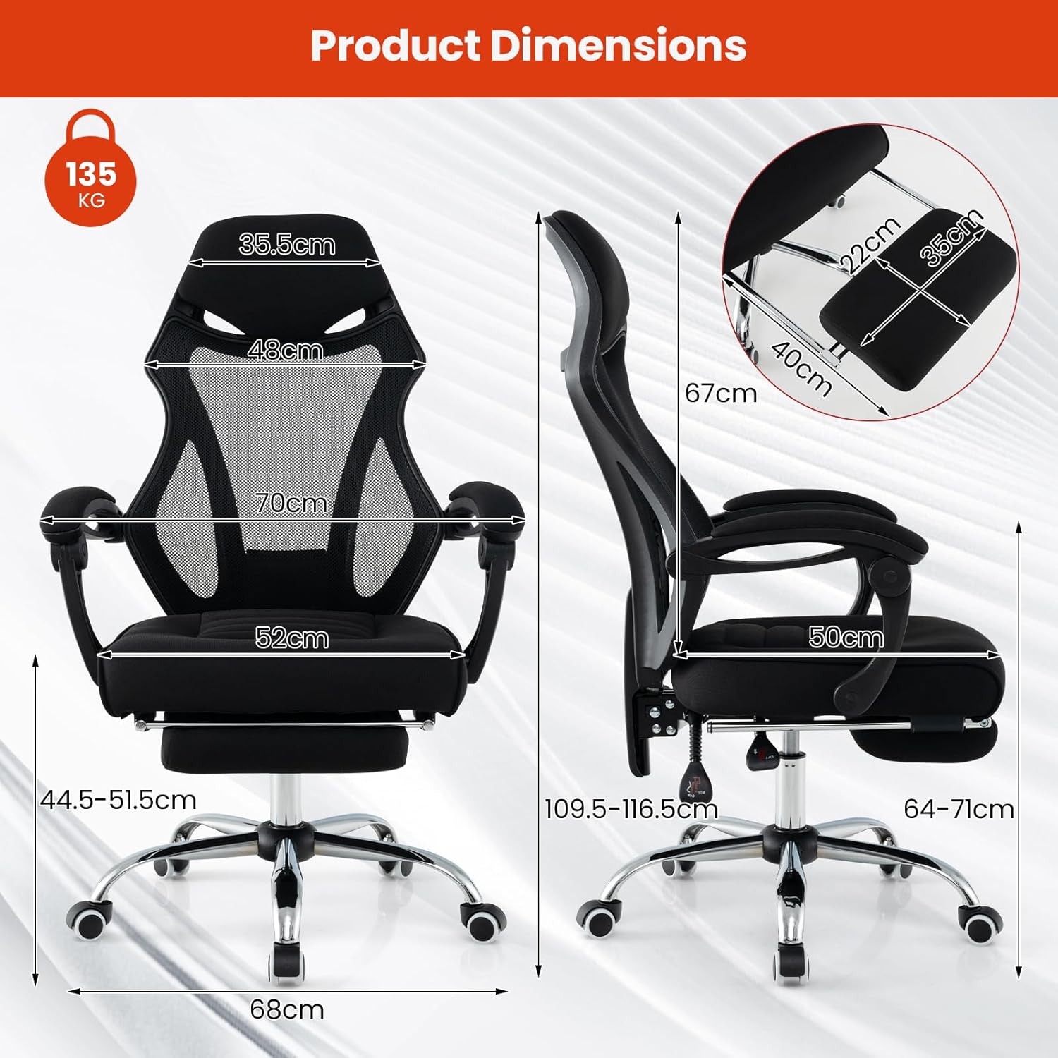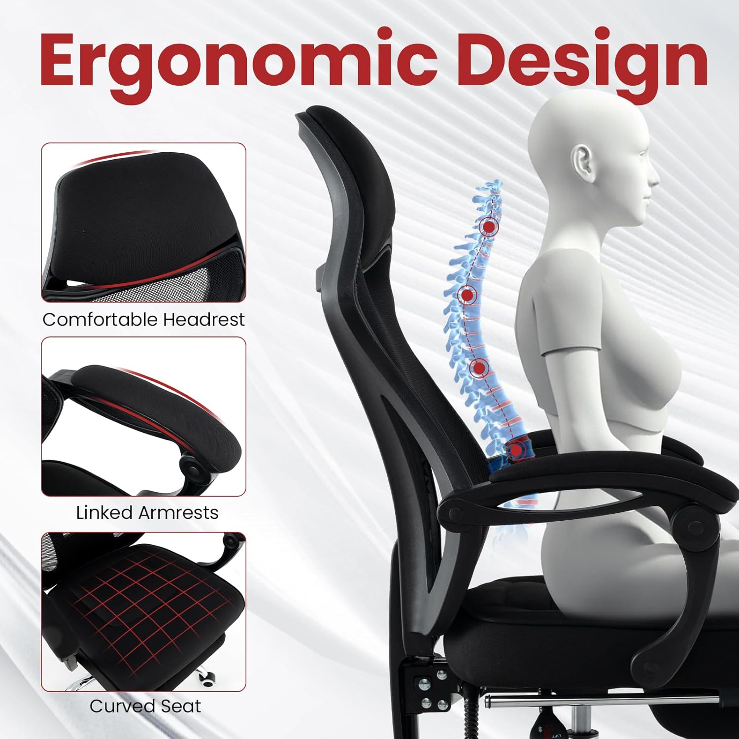 - Support intégral : notre chaise d'ordinateur inclinable vous soutient sous tous les angles. Le repose-pieds rétractable peu encombrant soutient vos jambes pendant les siestes, tandis que les accoudoirs articulés permettent une position confortable des bras à n'importe quel angle du dossier.