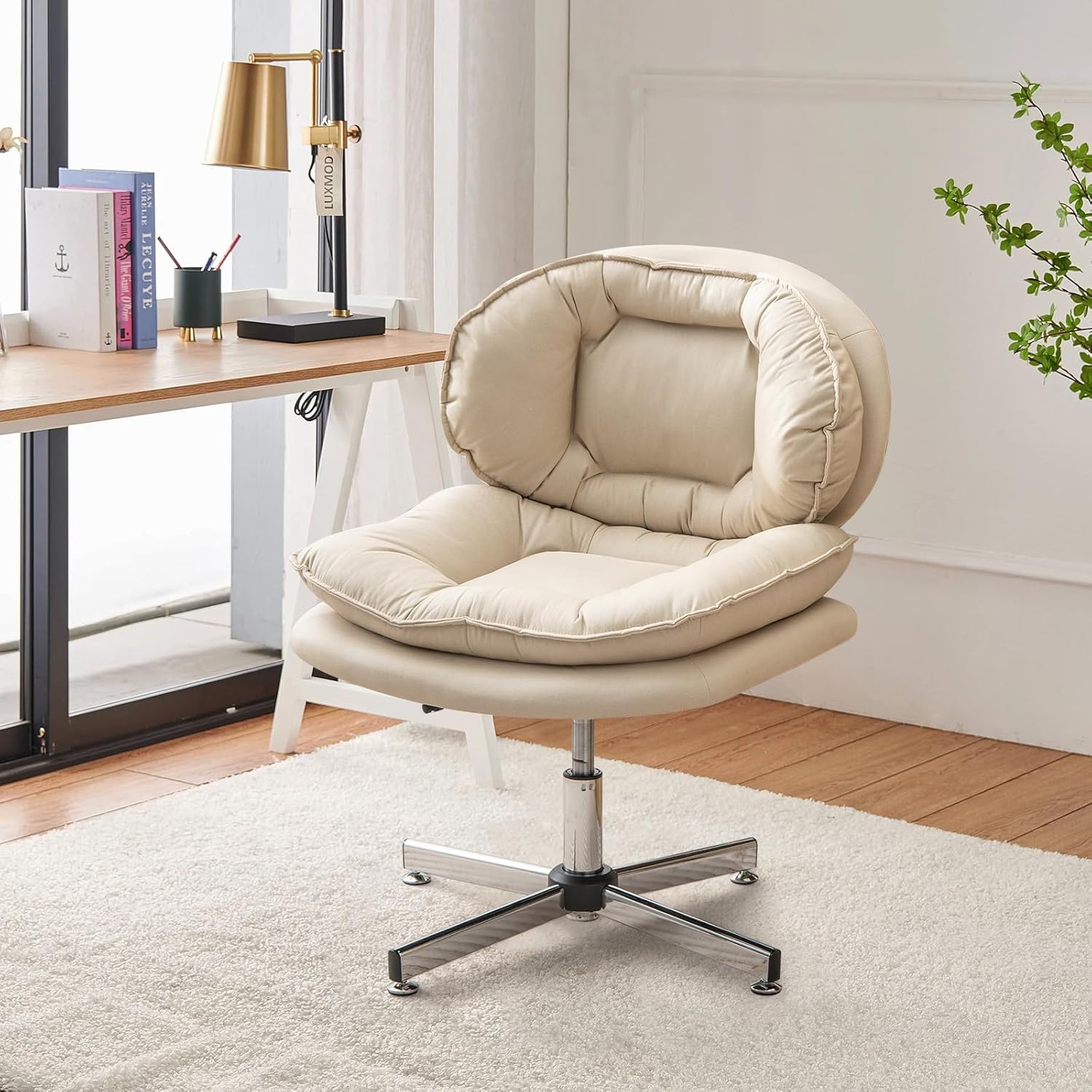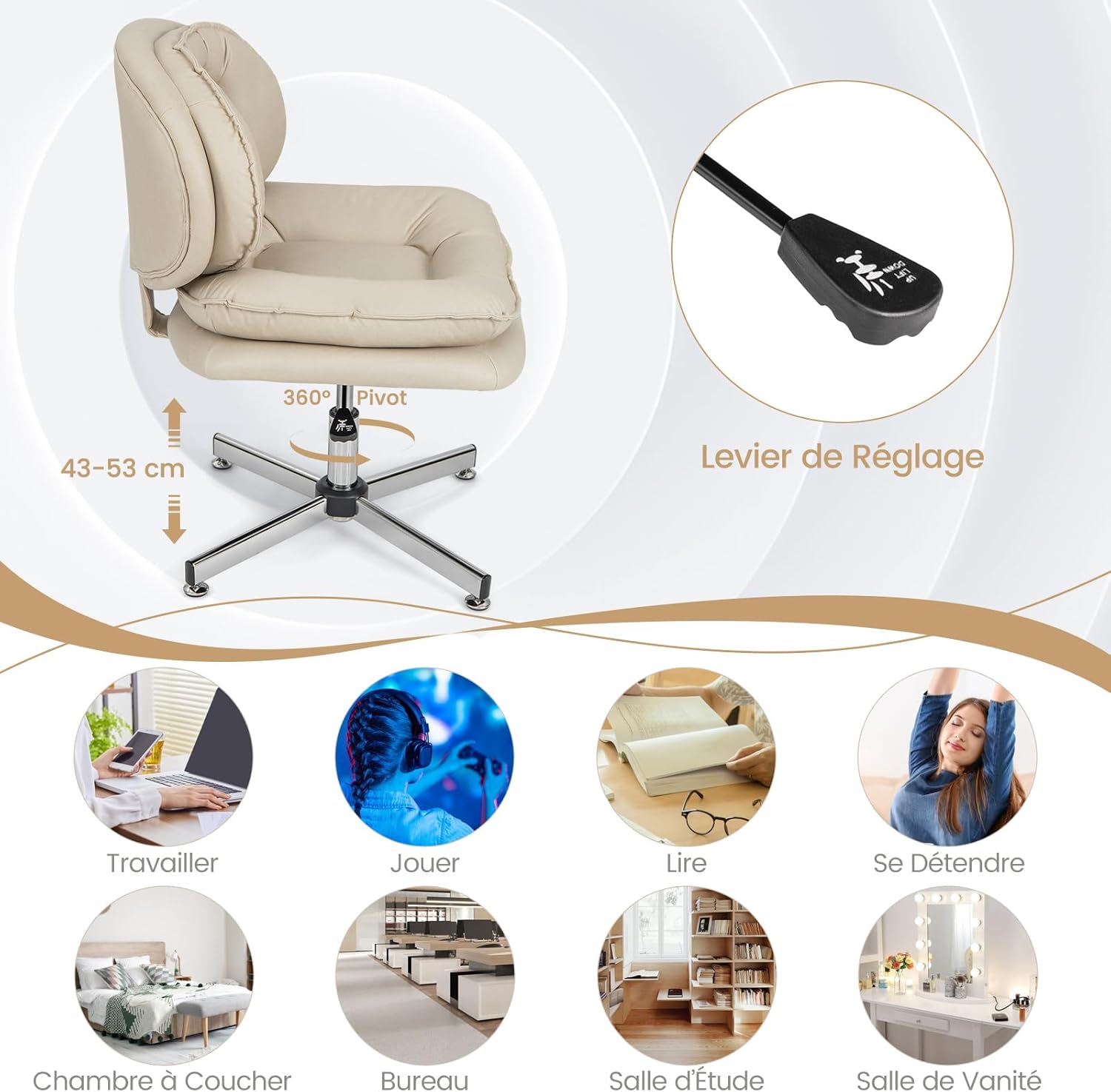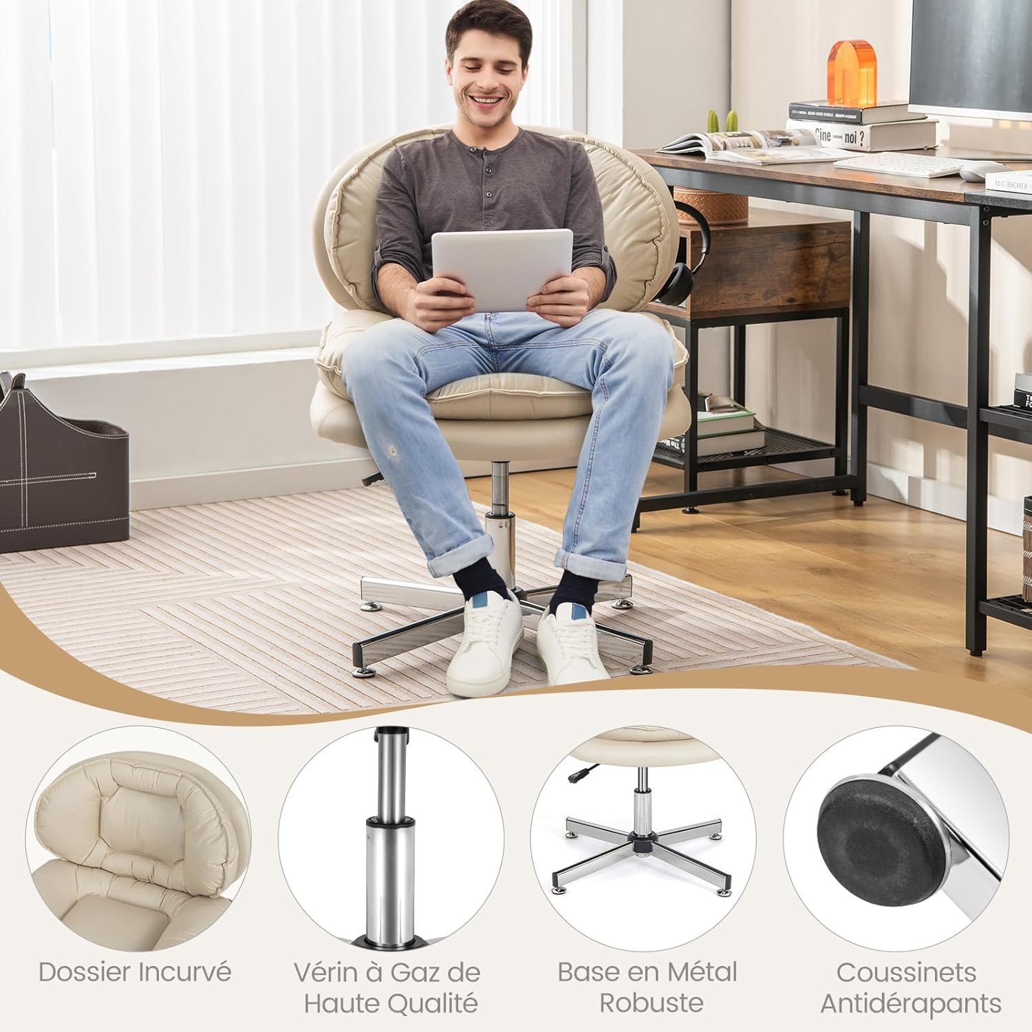 La chaise d'ordinateur dispose d'un dossier et d'une assise rembourrés à double couche et offre un confort optimal pour les longues sessions de travail ou de détente. Avec sa hauteur d'assise réglable de 43 à 53 cm et sa fonction de rotation à 360°, cette chaise de bureau à domicile est conçue pour un maximum de confort. La chaise pivotante en cuir de qualité supérieure est non seulement douce au toucher, mais est également facile à nettoyer. La structure en métal robuste avec coussinets antidérapants assure une stabilité générale avec une capacité de charge allant jusqu'à 150 kg. Cette chaise de travail est adaptée à une variété d'environnements et est idéale pour les bureaux à domicile, les configurations de jeu ou les coiffeuses, car elle allie à la fois fonctionnalité et style.