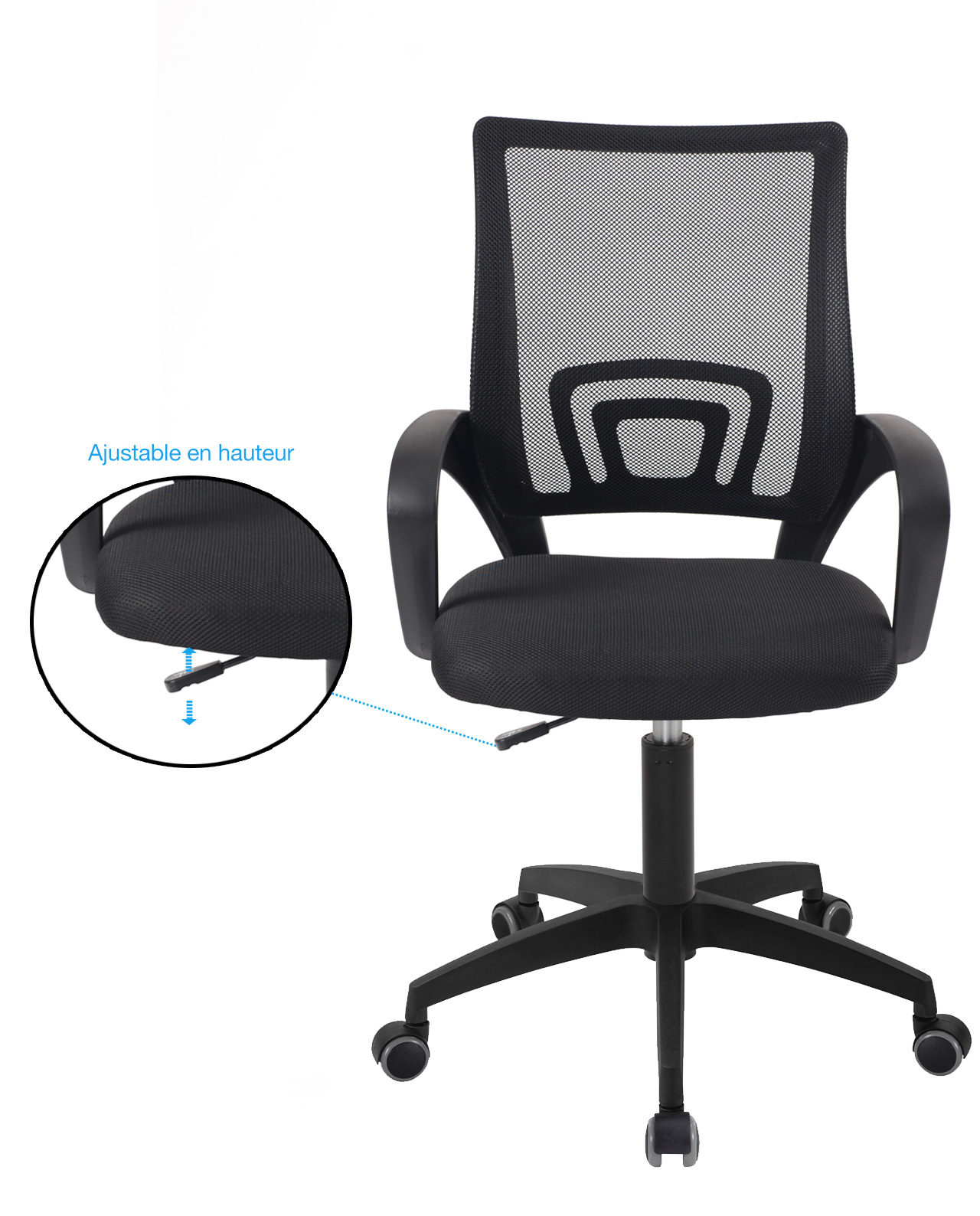 | Libellé | Chaise de bureau pivotante hauteur réglable siège textile renfort lombaire roulettes FLAG-E (Noir) |