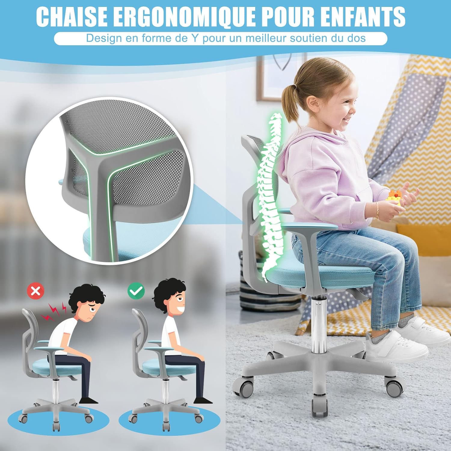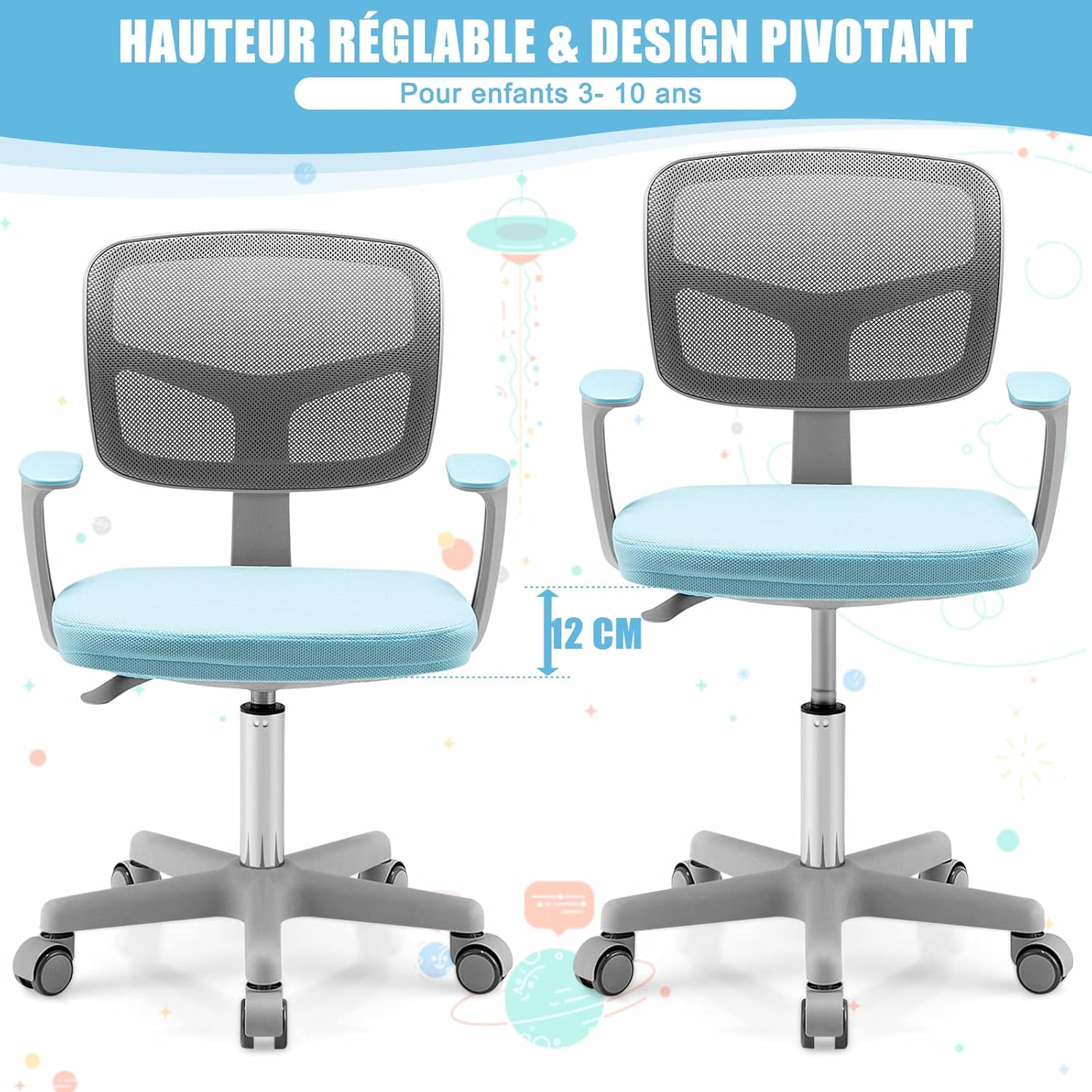 Chaise de bureau pour enfant, chaise d’étude avec dossier ergonomique et siège pivotant à 360°