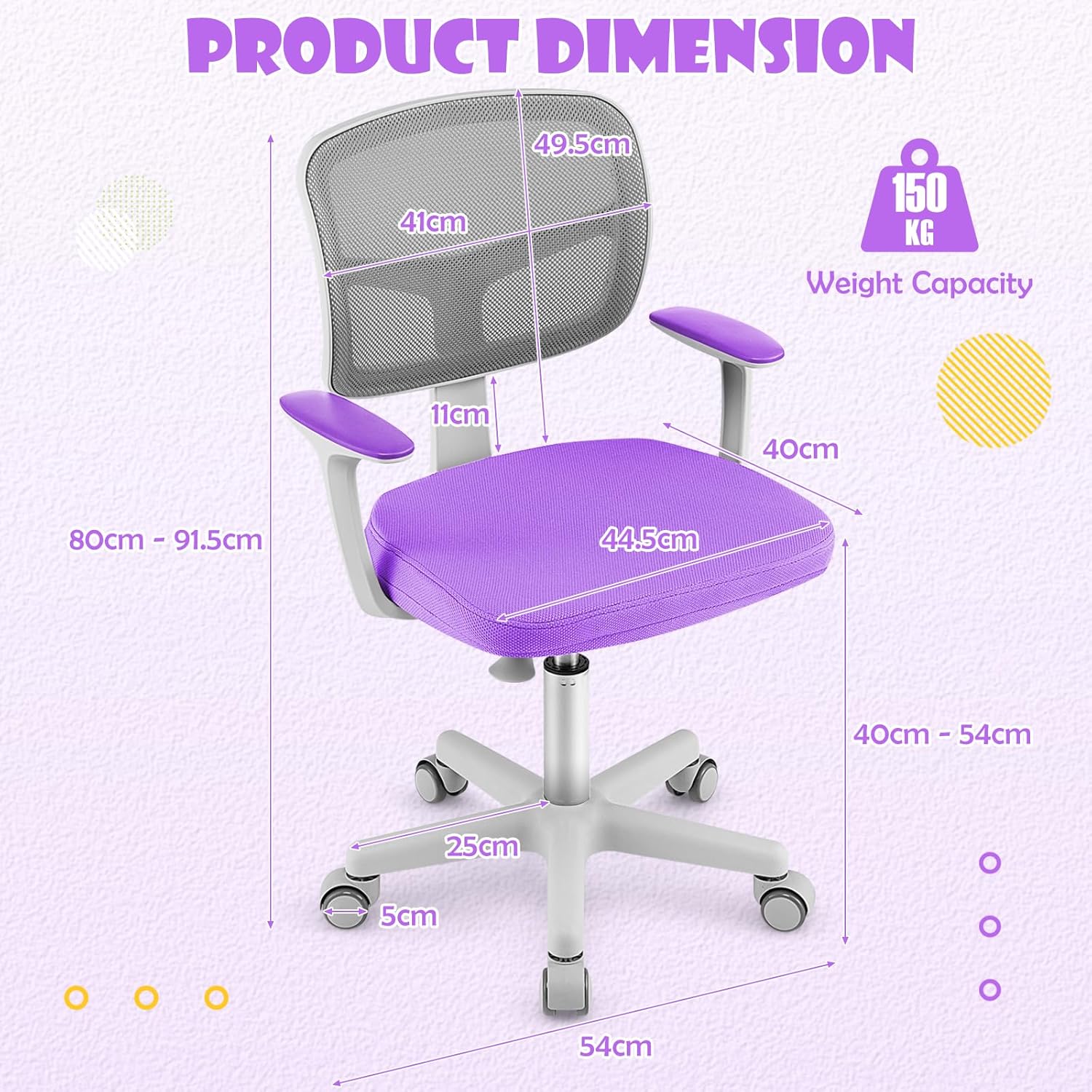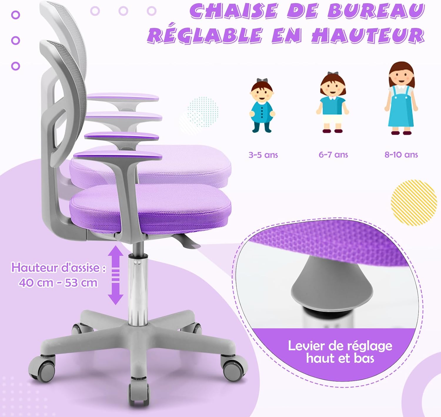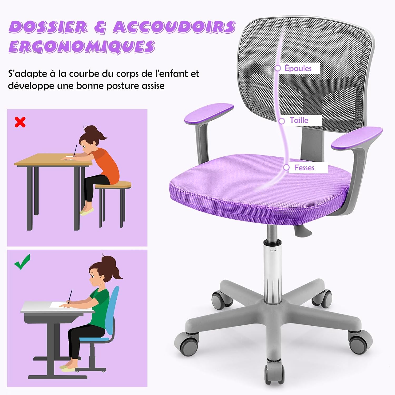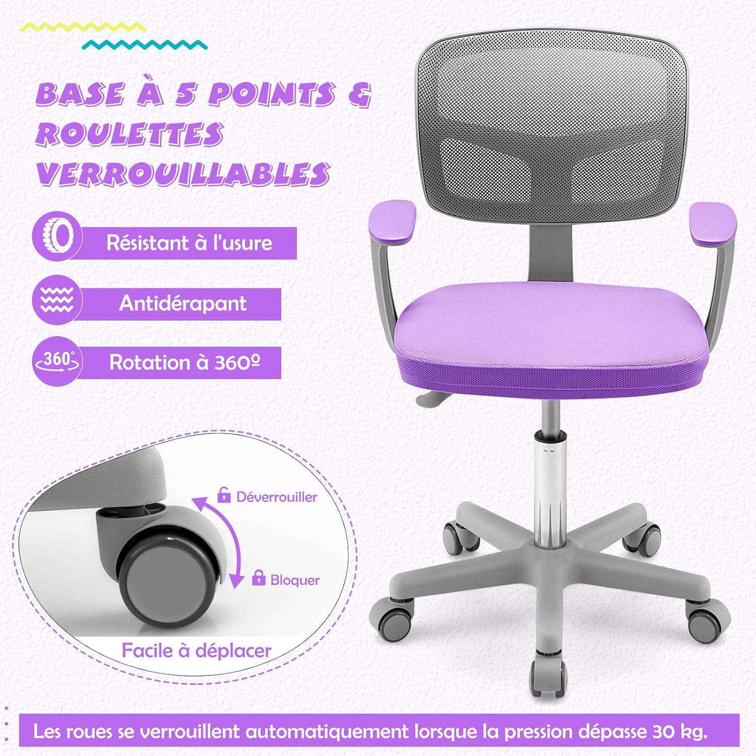 - 5 Roues Flexibles & Sécurisées : Cette chaise d'étude pour enfants est équipée de 5 roues durables et pivotantes à 360° qui assurent un déplacement flexible et doux. En outre, ces roues sont sensibles à la pression et se bloquent automatiquement pour empêcher la chaise de bouger lorsque quelqu'un est assis.