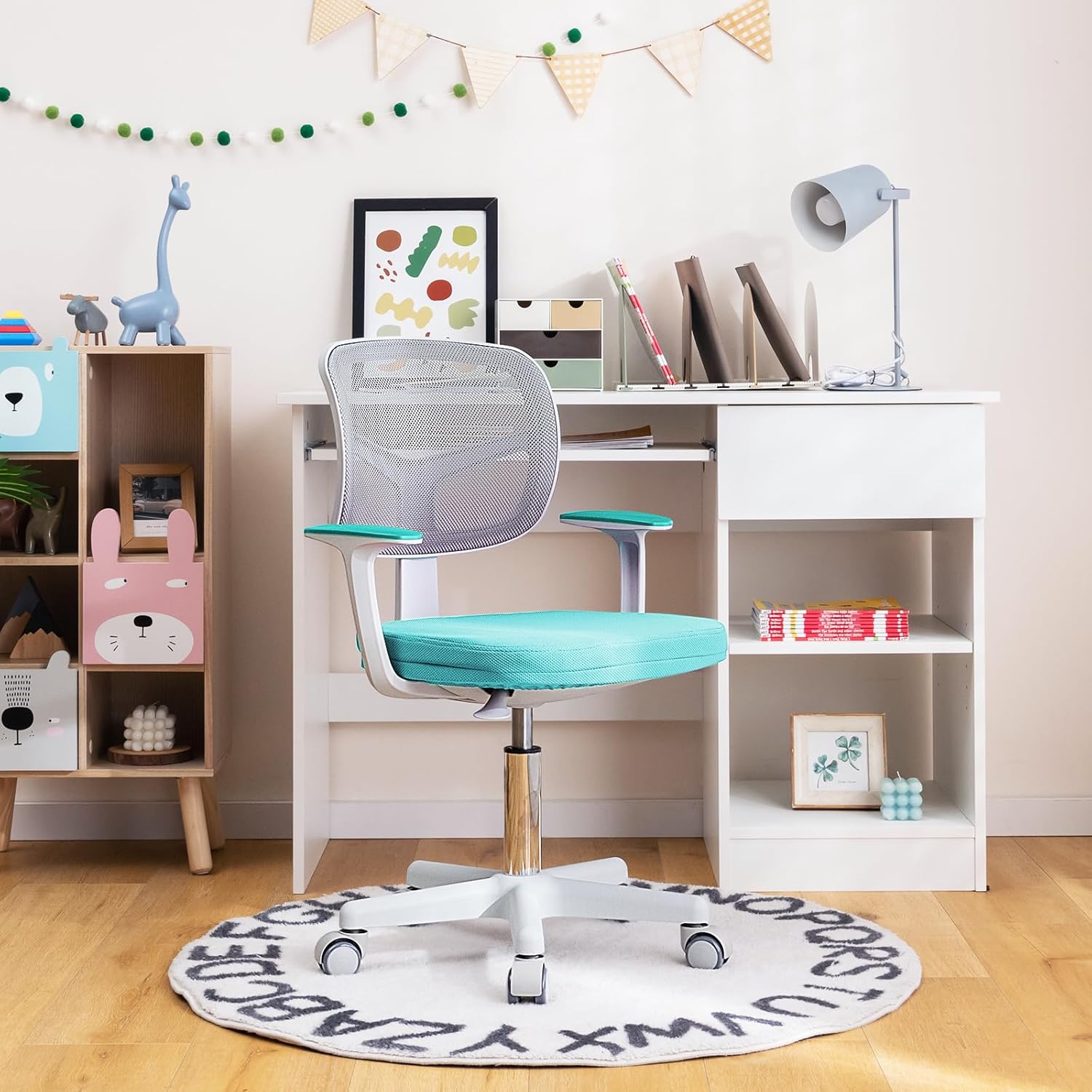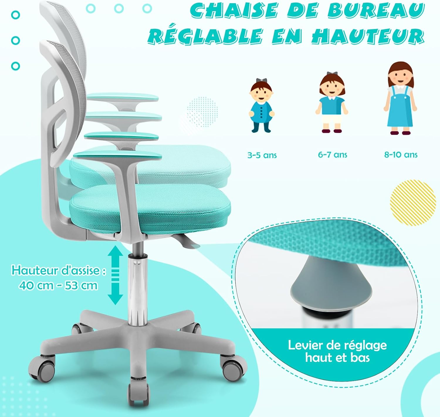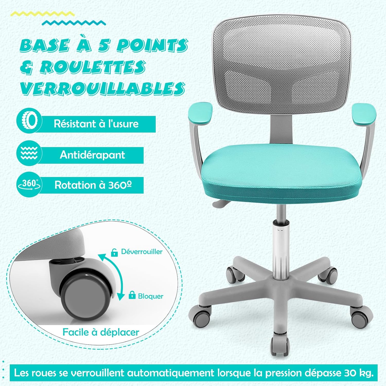- 5 Roues Flexibles & Sécurisées : Cette chaise d'étude pour enfants est équipée de 5 roues durables et pivotantes à 360° qui assurent un déplacement flexible et doux. En outre, ces roues sont sensibles à la pression et se bloquent automatiquement pour empêcher la chaise de bouger lorsque quelqu'un est assis.