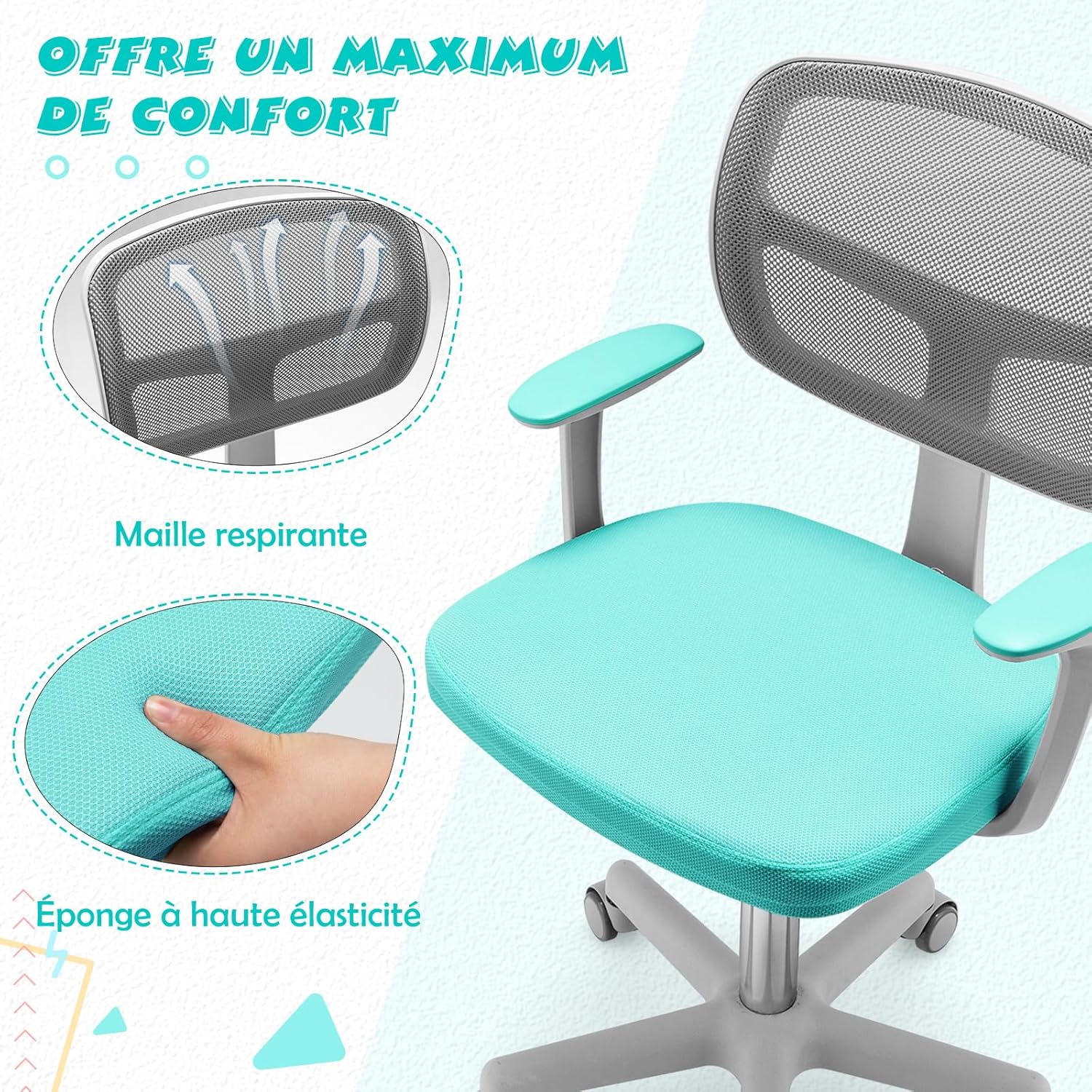 - Matériaux en Qualité pour l'Assise Confortable : Des matériaux de haute qualité assurent une bonne durée de vie à cette chaise pour enfants, avec un tissu en maille respirante et une mousse à haute élasticité pour une assise confortable. Les accoudoirs offrent également un bon soutien pour les coudes et les poignets.