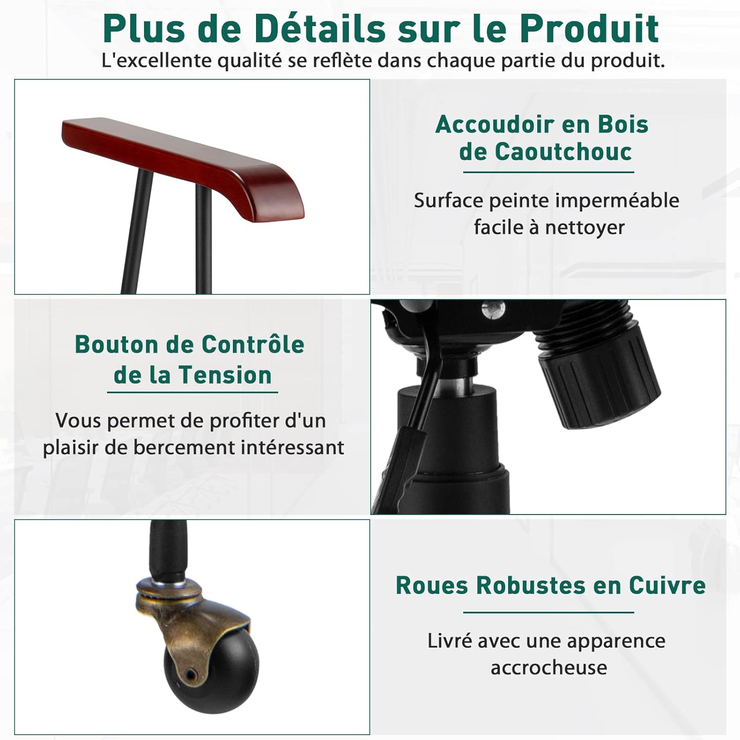 - Style rétro et élégant : Notre chaise de bureau mobile adopte un style rétro et élégant afin d’apporter une touche esthétique à la maison. Les accoudoirs en bois d’hévéa dispose d’une surface avec des grains délicats, et les roulettes en cuivre sont équipée d’un lustre métallique.
