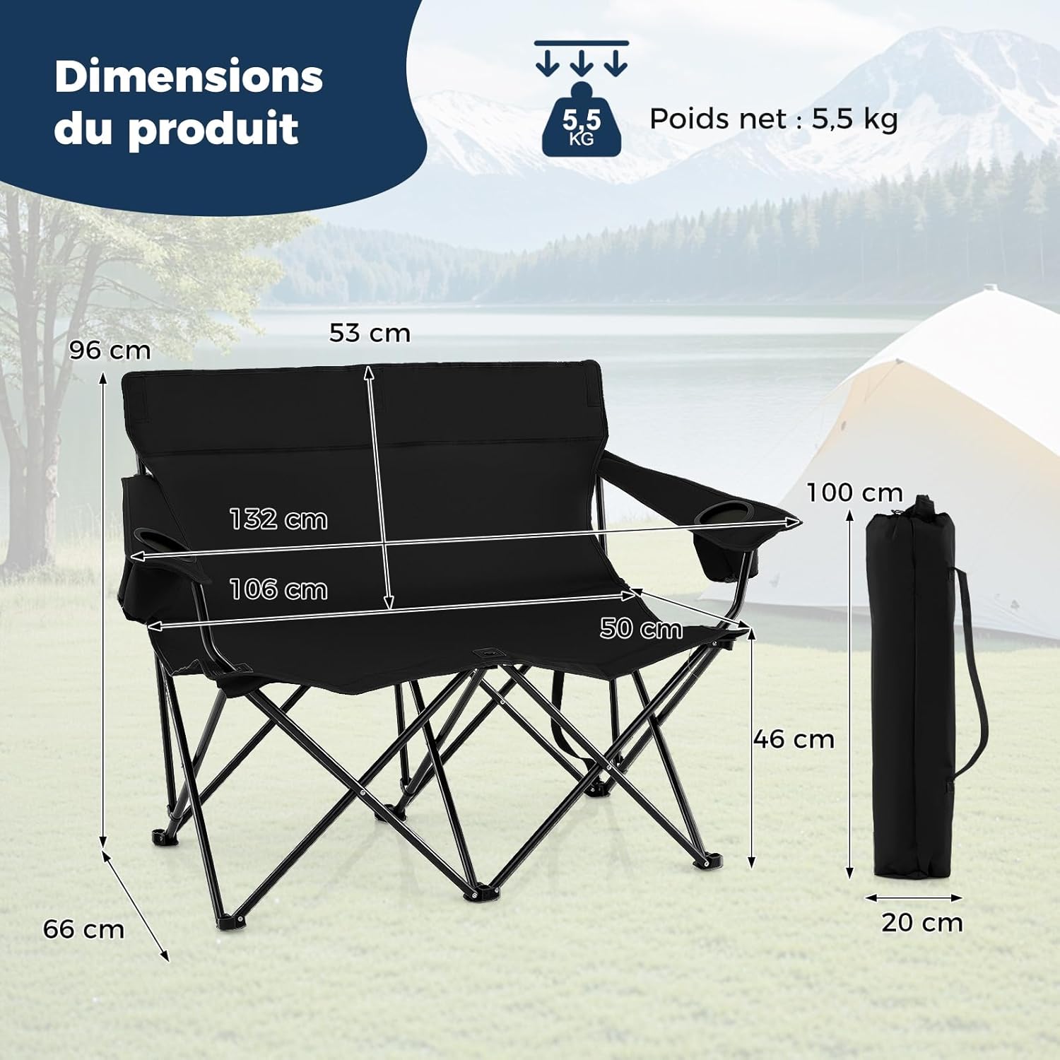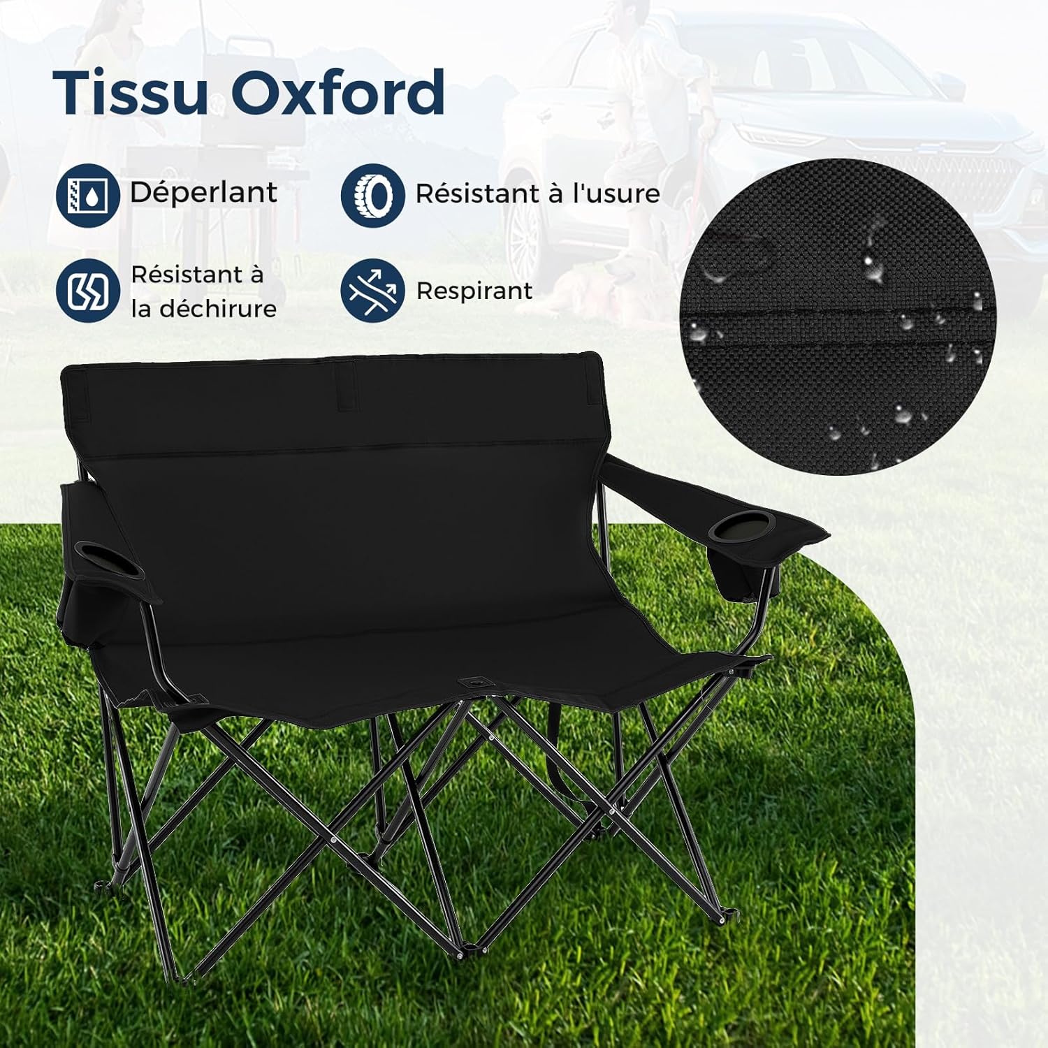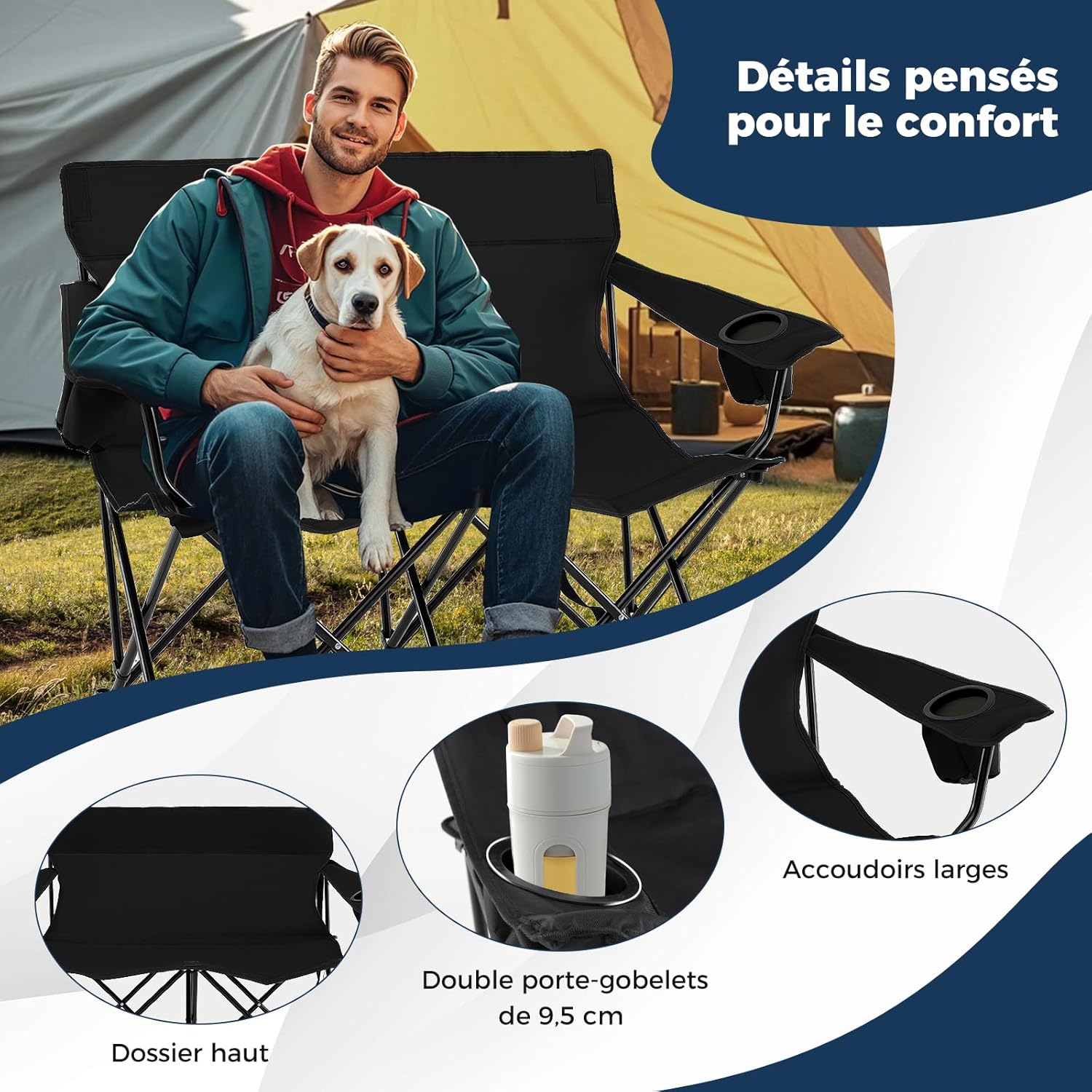 | Libellé | Chaise de camping 2 places, avec dossier confortable accoudoirs avec poches latérales chaise pliable noir |