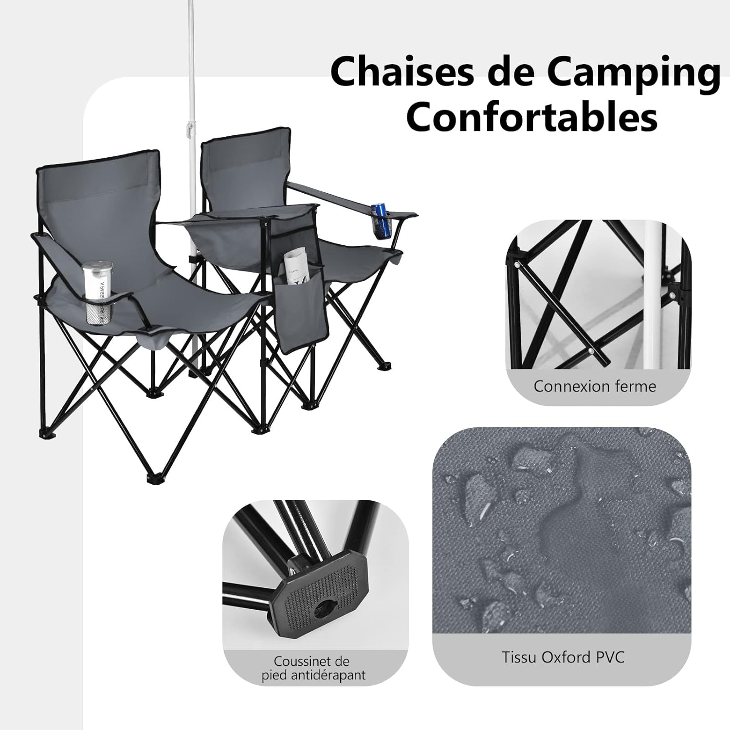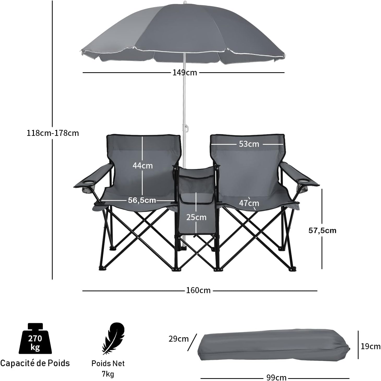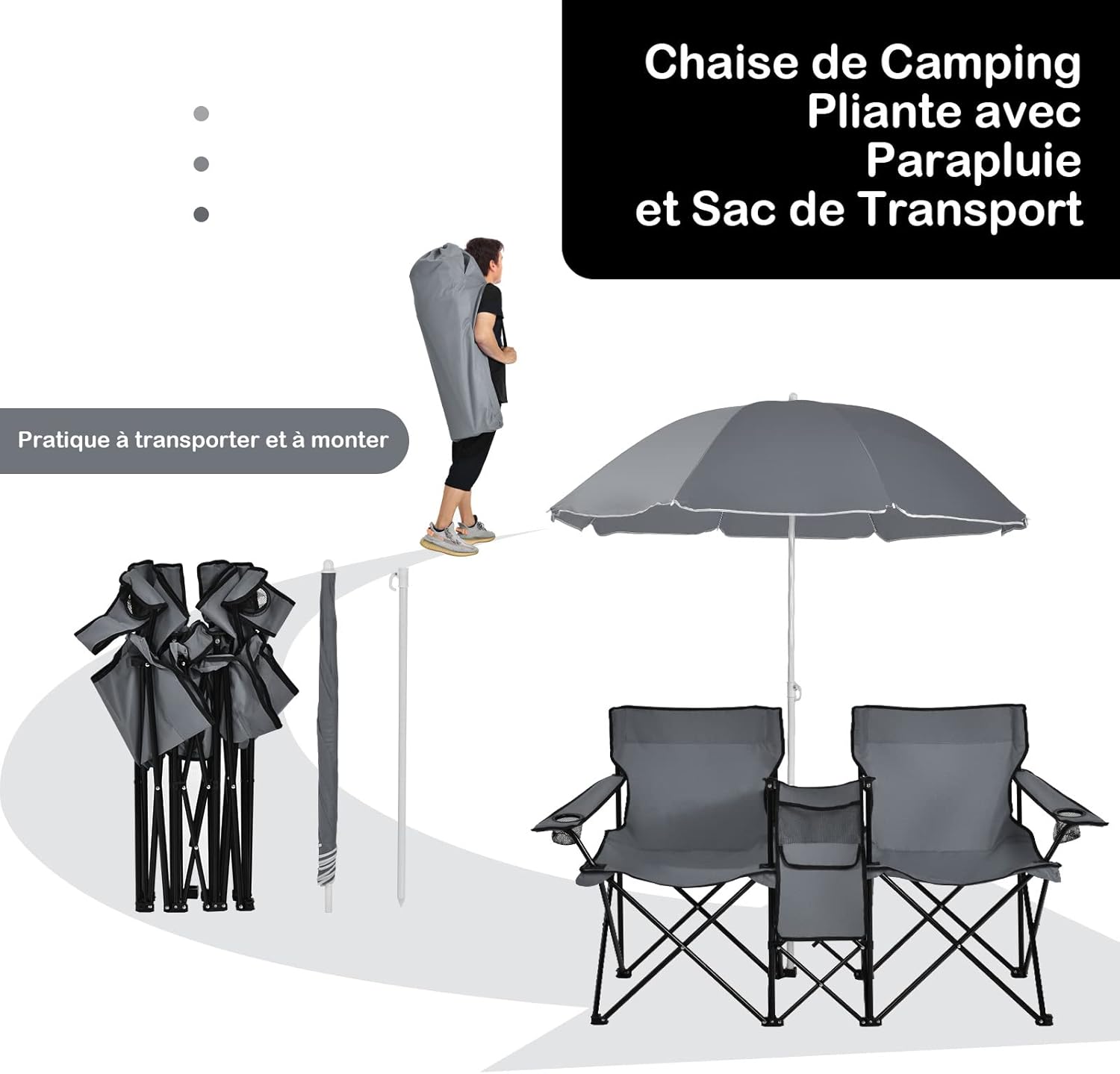 | Libellé | Chaise de camping pliante 2 places avec parasol fauteuil camping extérieur avce poche porte-gobelets et sac de transport, idéal pour plage pêche gris |
