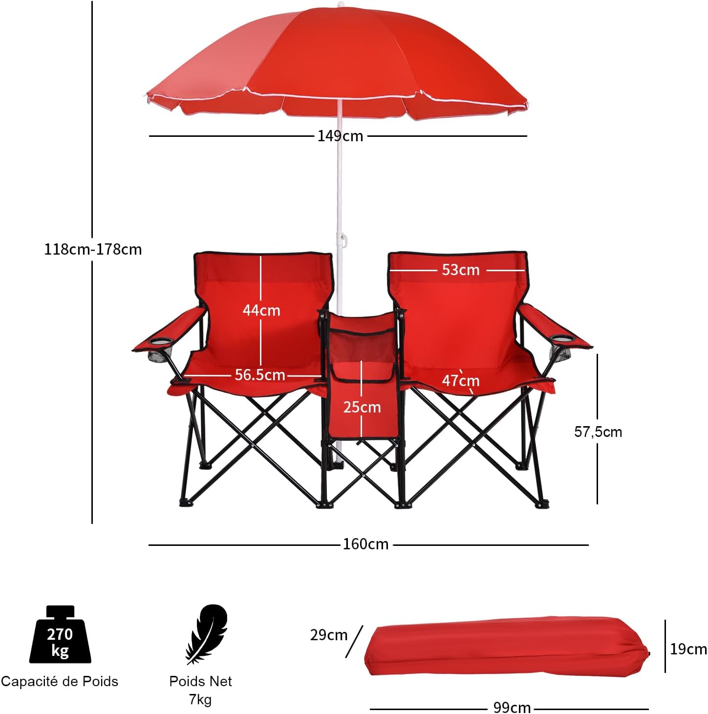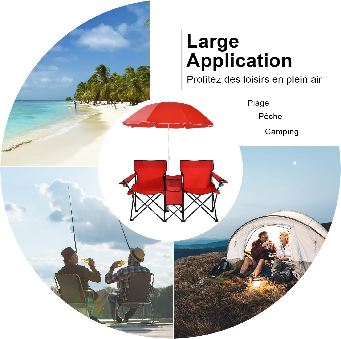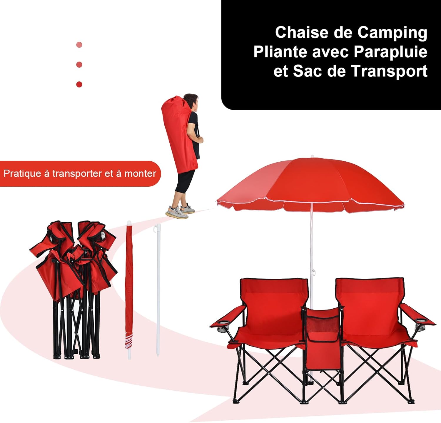 | Libellé | Chaise de camping pliante 2 places avec parasol, fauteuil camping extérieur avec poche, porte-gobelets |