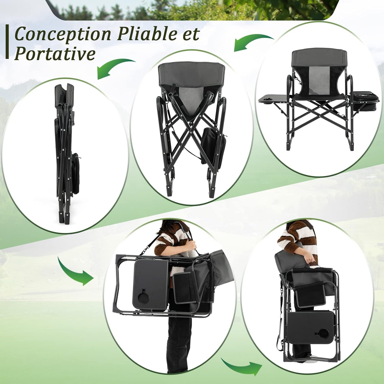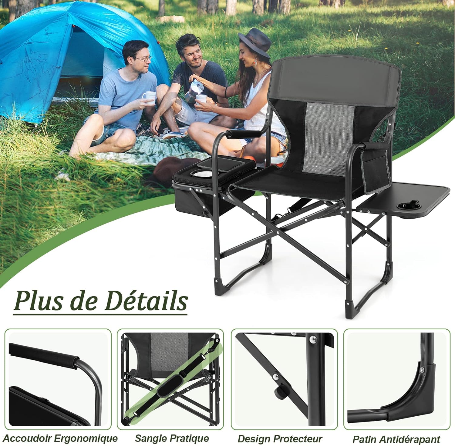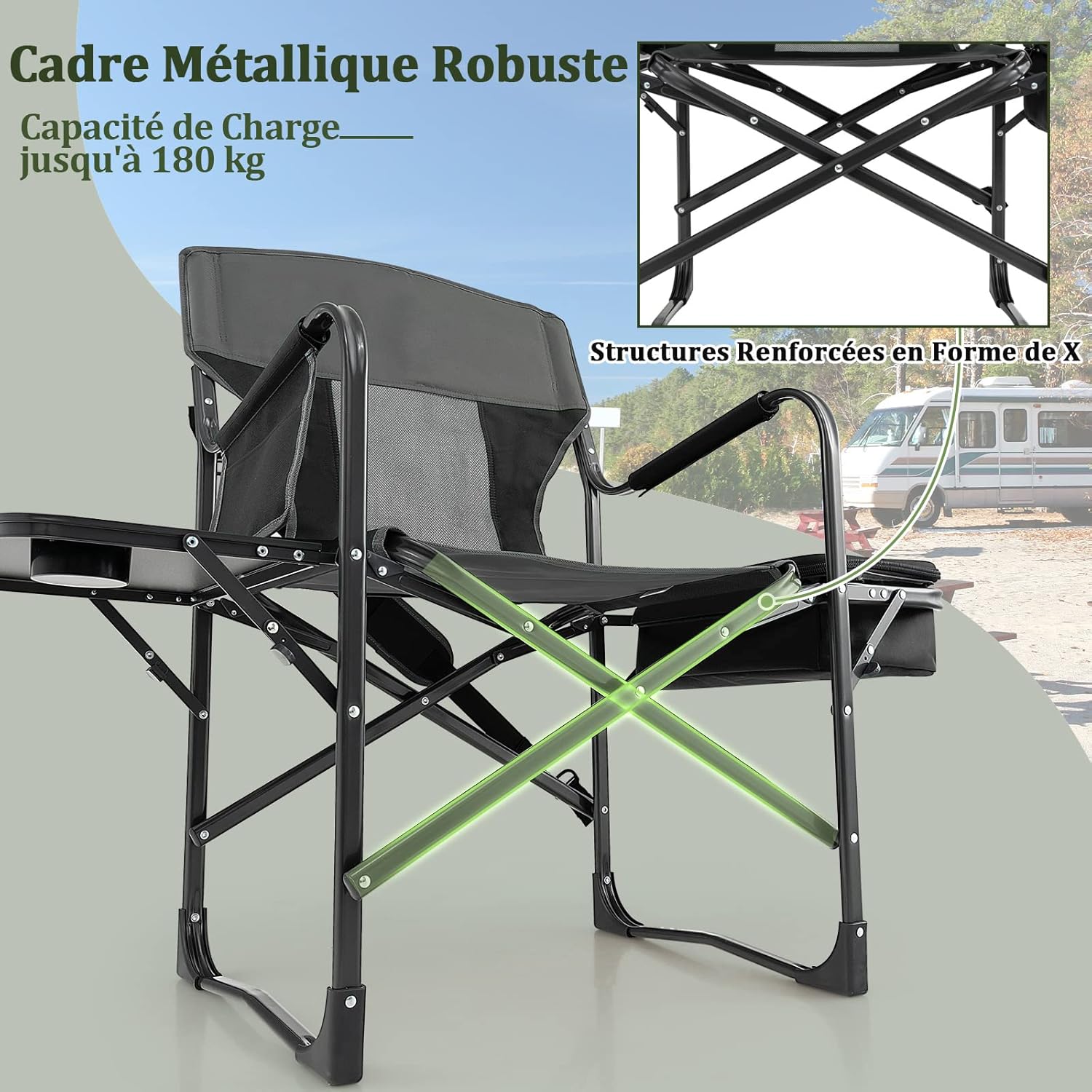 | Libellé | Chaise de camping pliante avec table latérale sac isotherme charge 180kg chaise de réalisateur portable avec poche latérale accoudoirs noir |