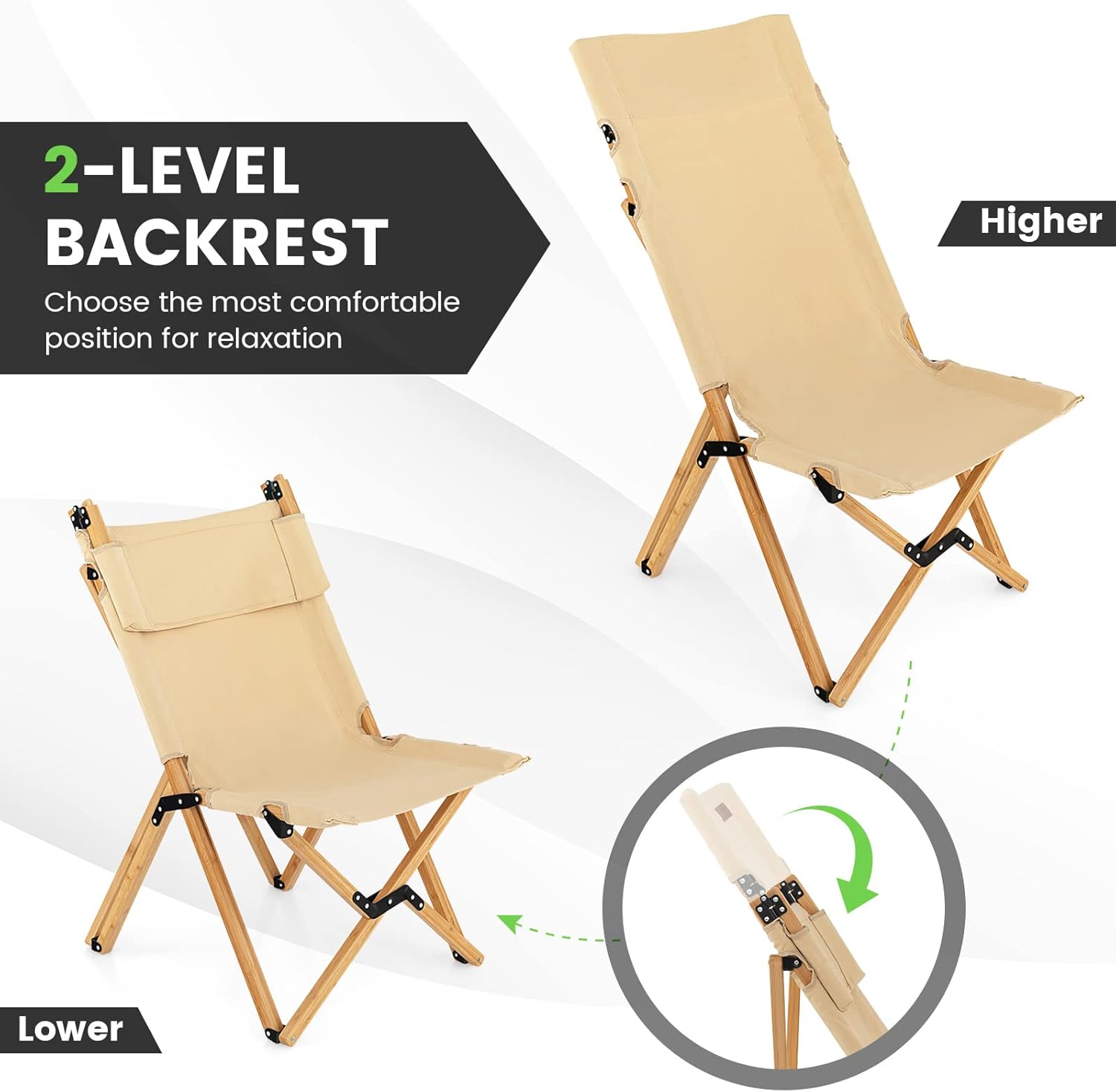 Chaise de camping pliante en bambou charge 150kg avec dossier réglable à 2 niveaux, chaise pliante