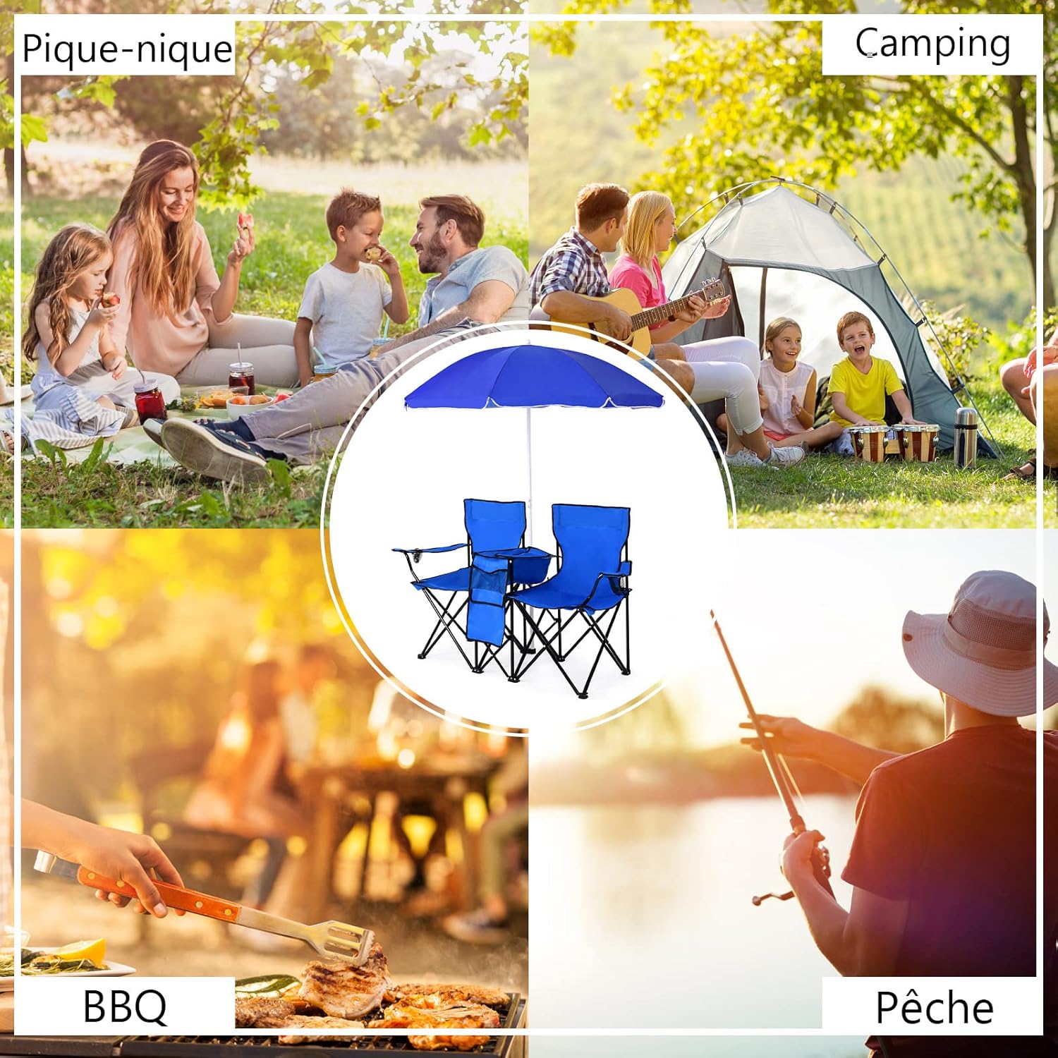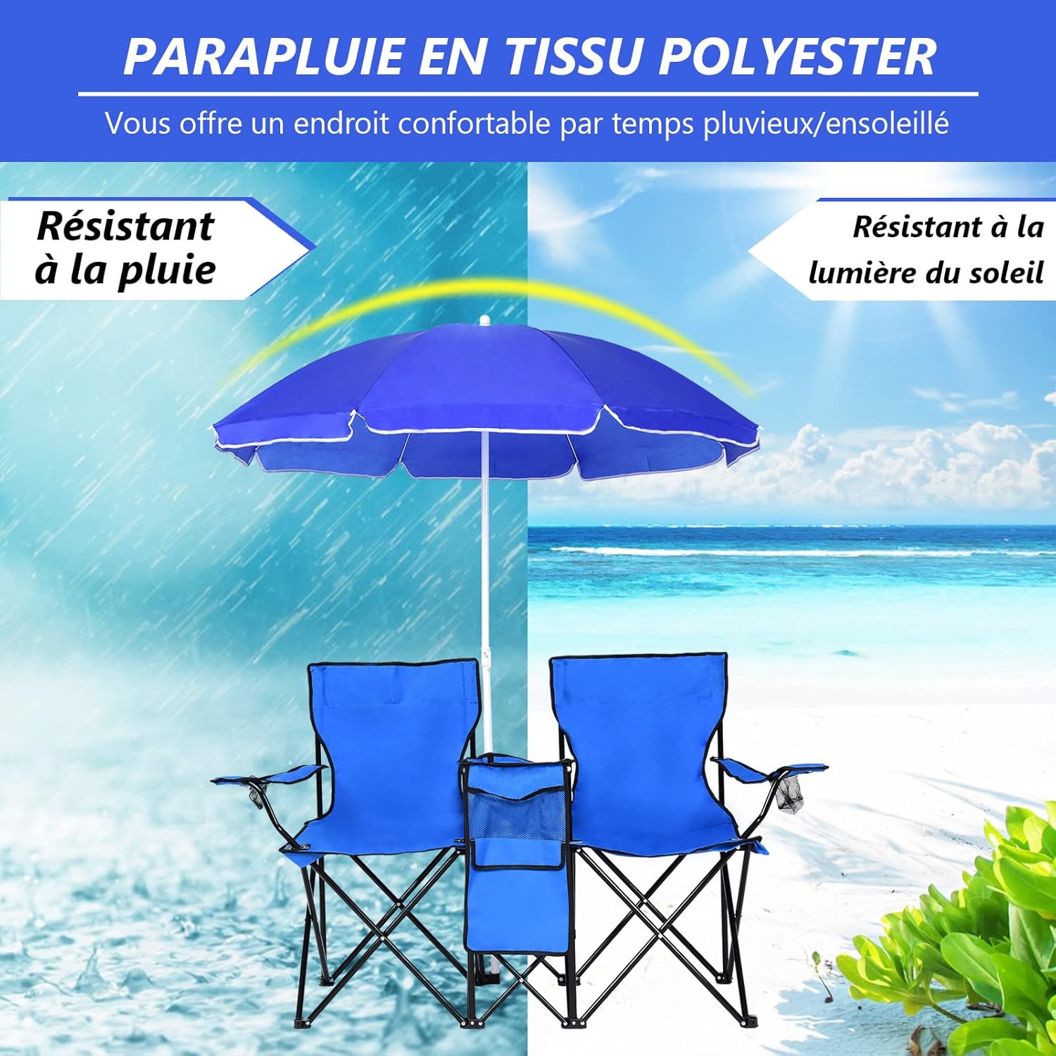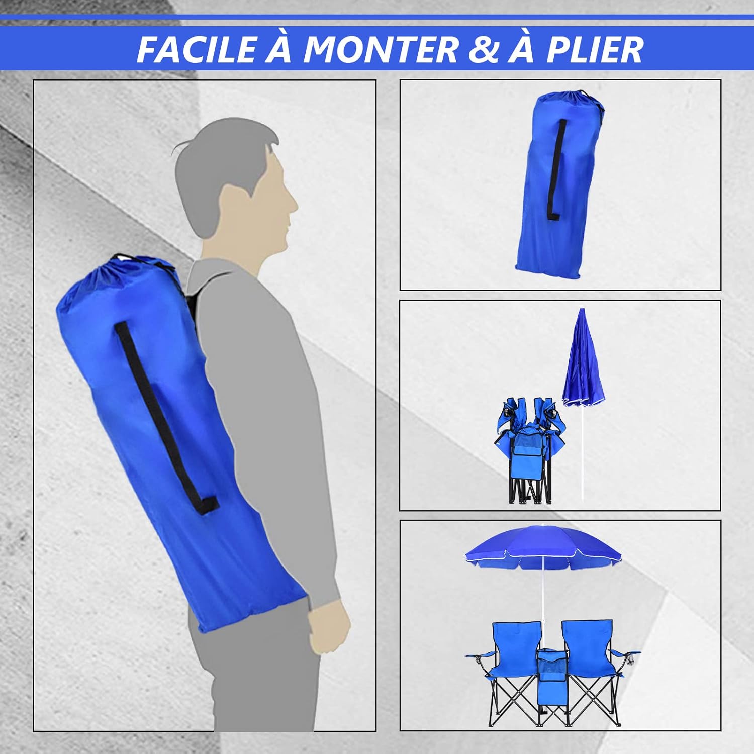 | Libellé | Chaise de camping pliante extérieur 2 places avec parasol, poche porte-gobelets et sac de transport, bleu |