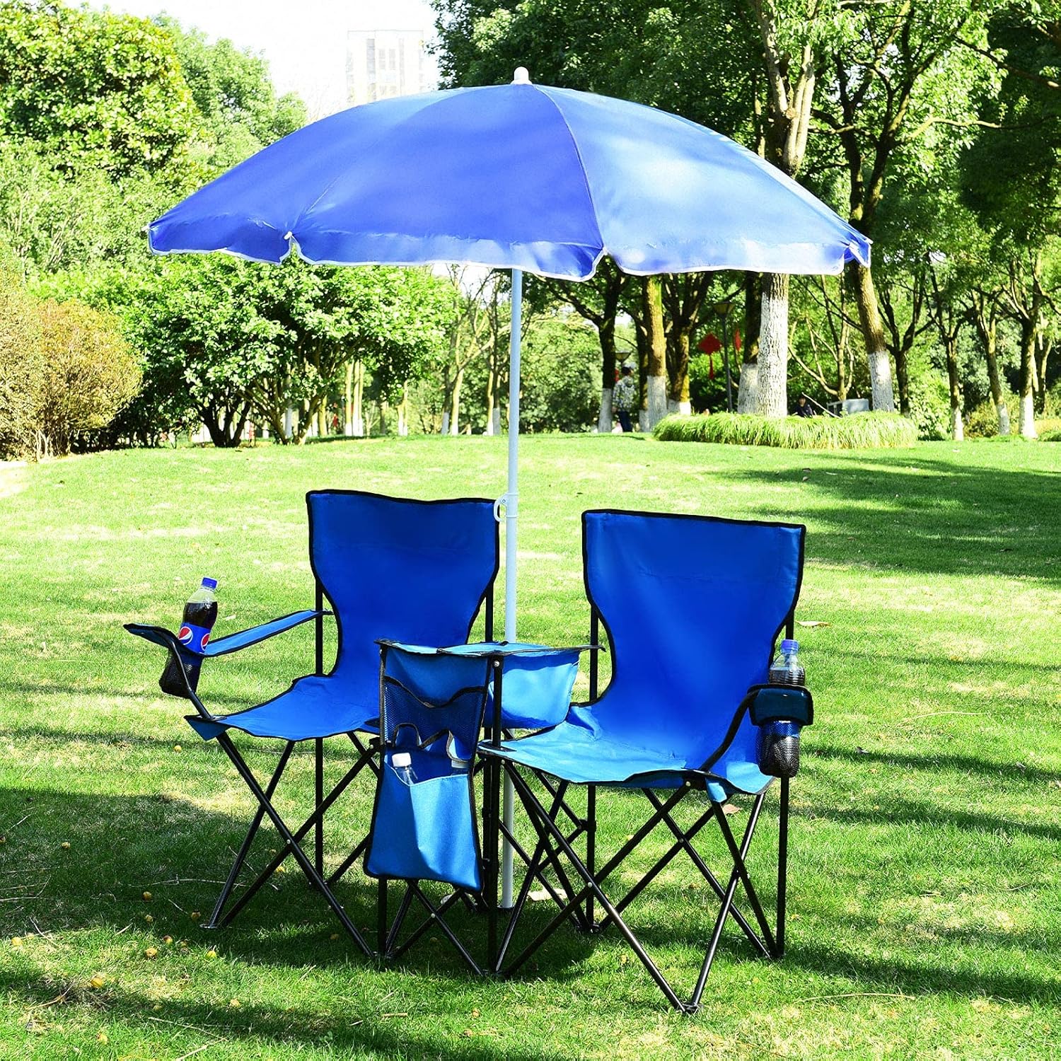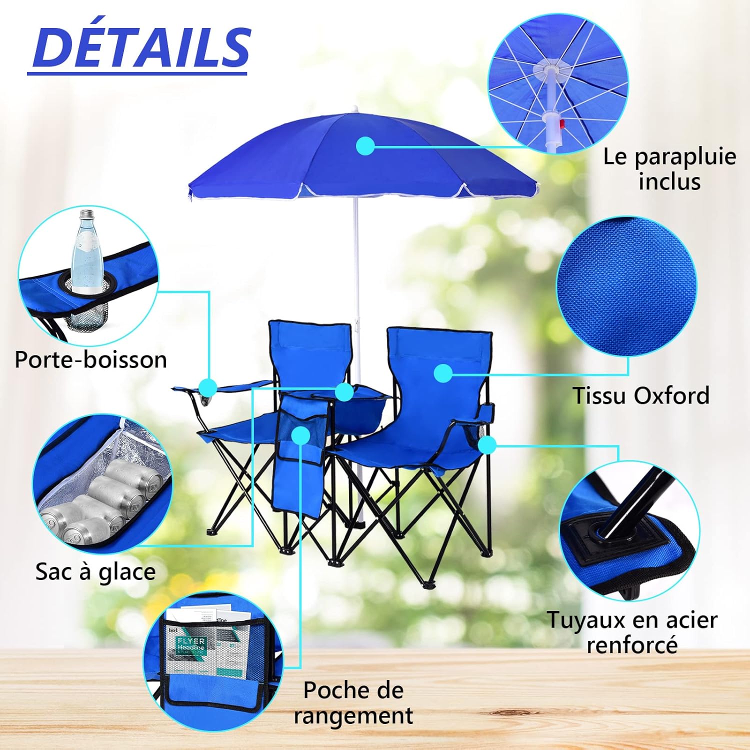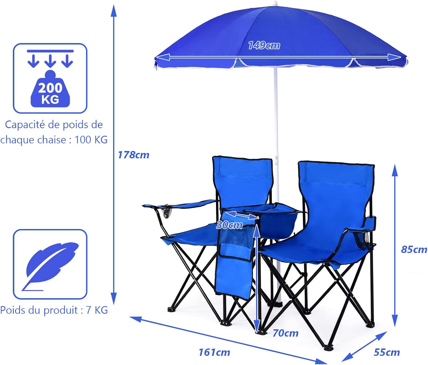 | Libellé | Chaise de camping pliante extérieur 2 places avec parasol, poche porte-gobelets et sac de transport, bleu |