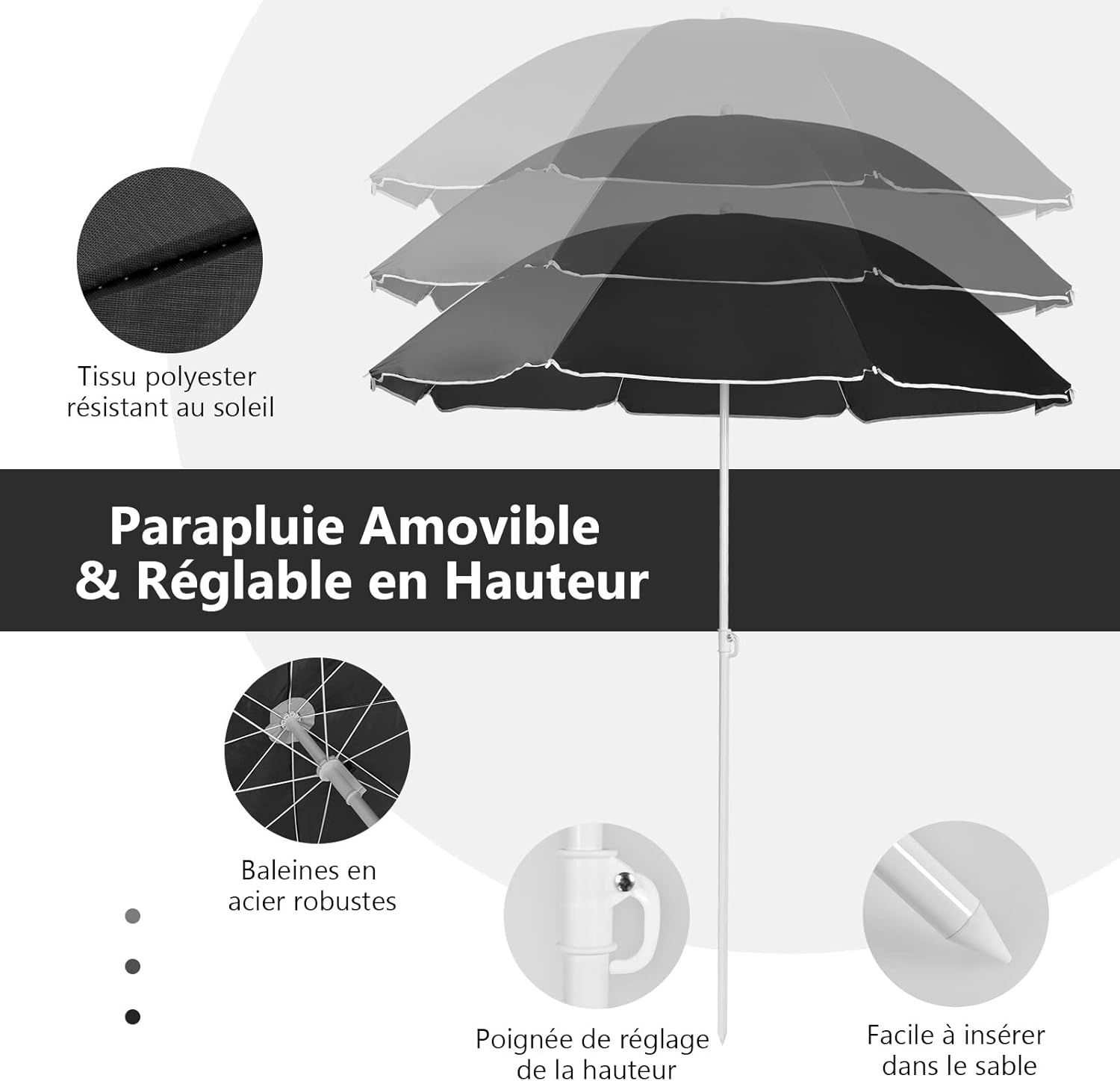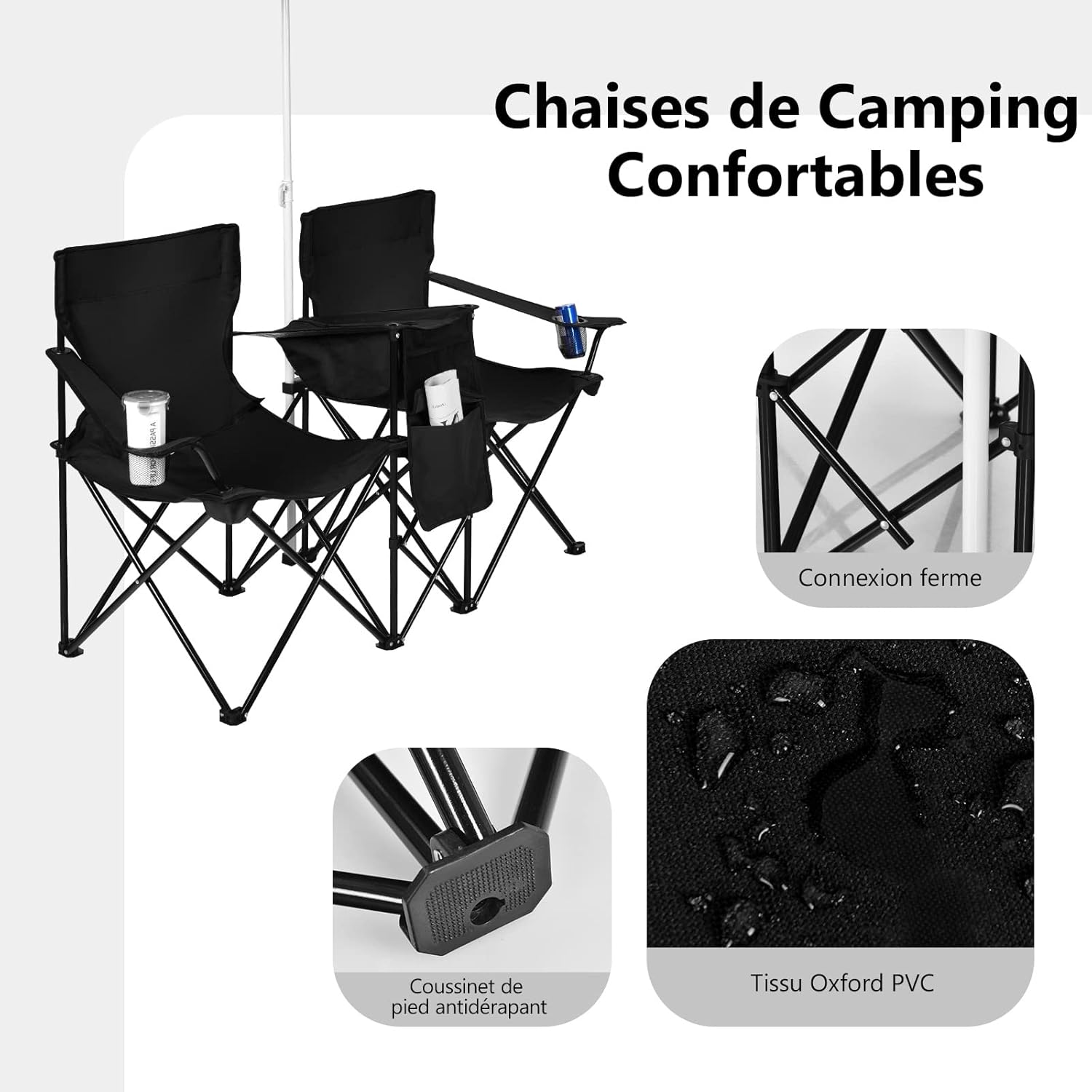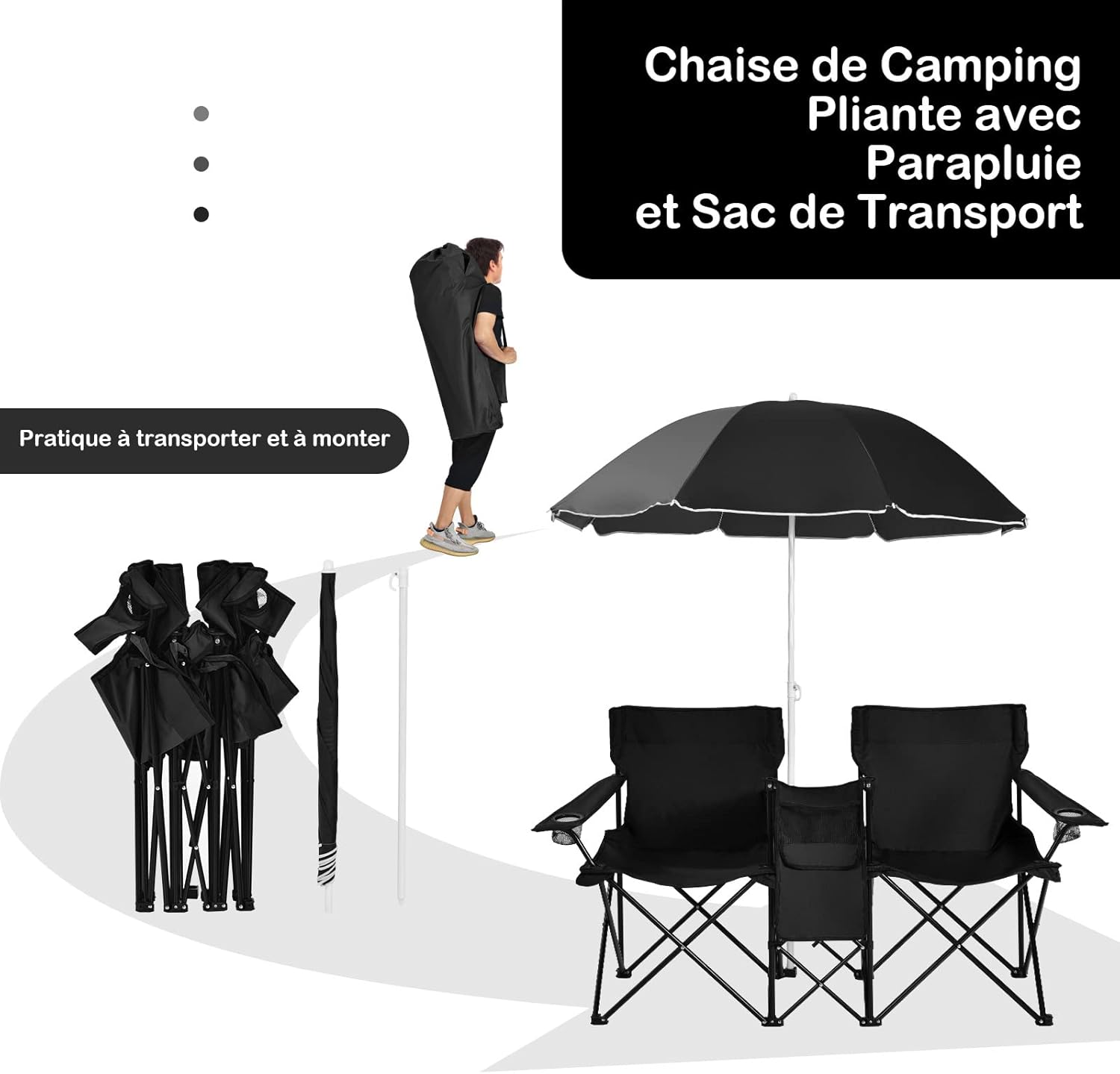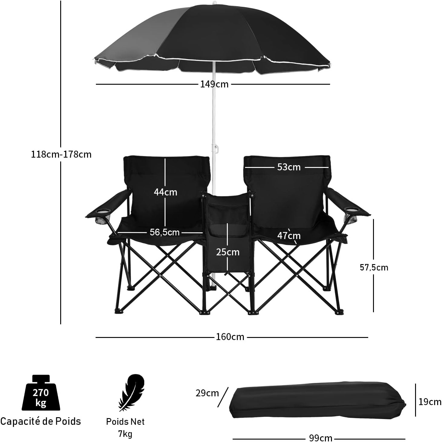 | Libellé | Chaise de camping pliante extérieur 2 places avec parasol, poche porte-gobelets et sac de transport, noir |