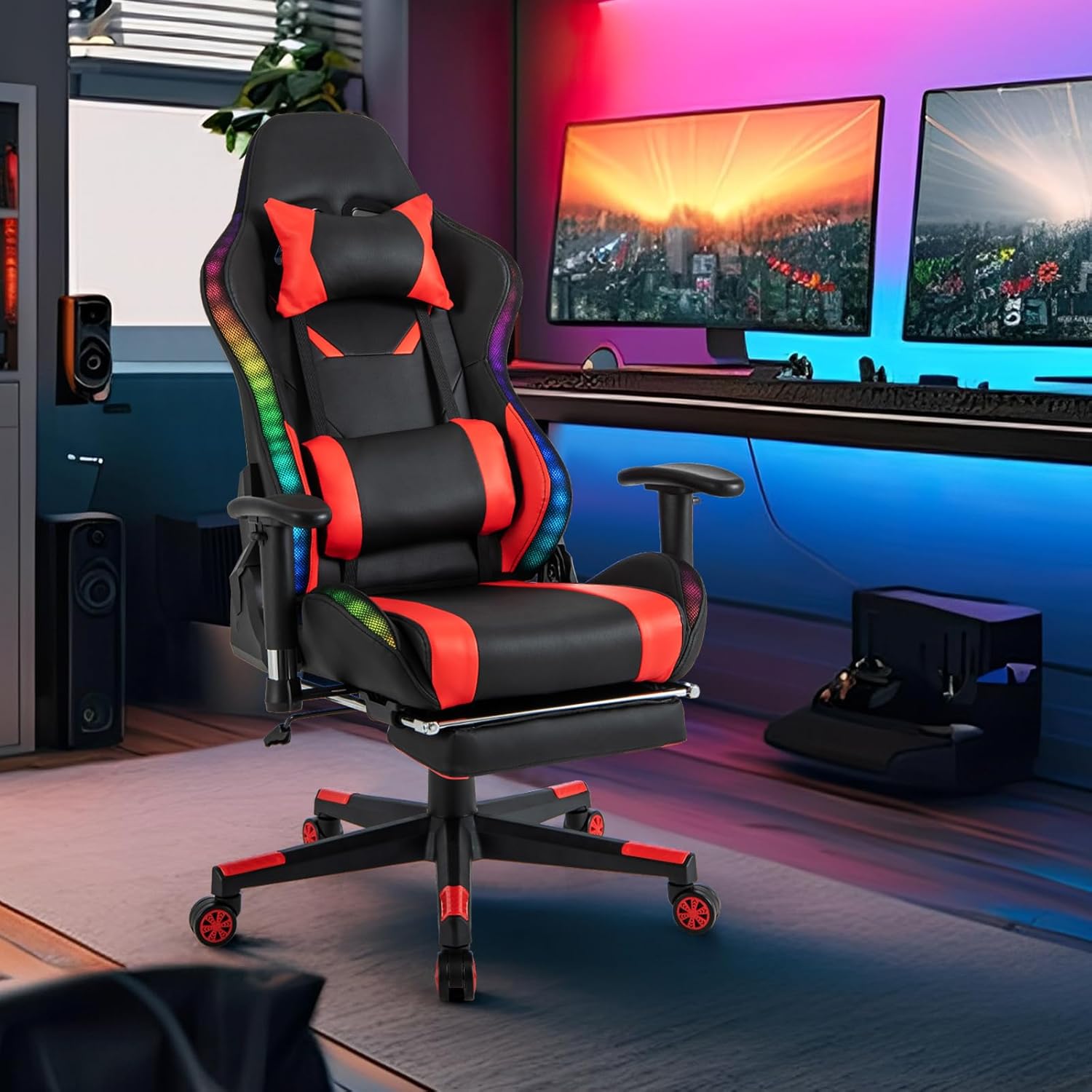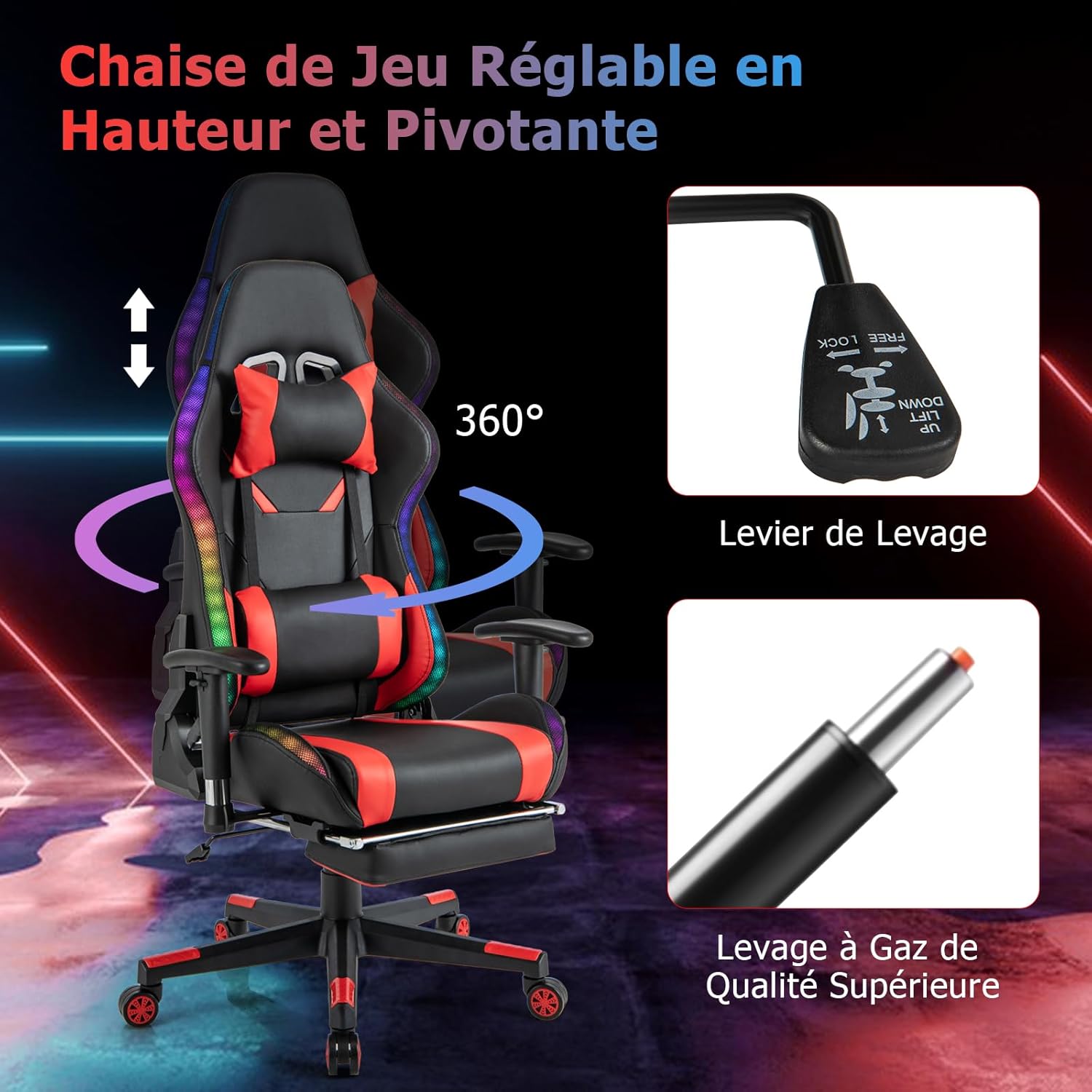 Notre chaise de jeu peut ajuster l'angle du dossier et la hauteur du siège de manière arbitraire. Vous pouvez l'ajuster en fonction de vos différents besoins et vous offrir l'expérience la plus confortable. En outre, il y a un repose-pieds en métal rétractable au bas du siège, pour que vous puissiez vous asseoir ou vous allonger pour vous reposer. L'accoudoir est fait de matériau de surface en PU durable. De plus, l'accoudoir peut également être tourné à 60° vers la gauche et vers la droite pour vous offrir une expérience différente. Les cinq roues universelles sur la partie inférieure peuvent être déplacées facilement et les lumières colorées sur le dossier de la chaise peuvent augmenter l'atmosphère du jeu. Venez emporter chez vous notre chaise de jeu premium !