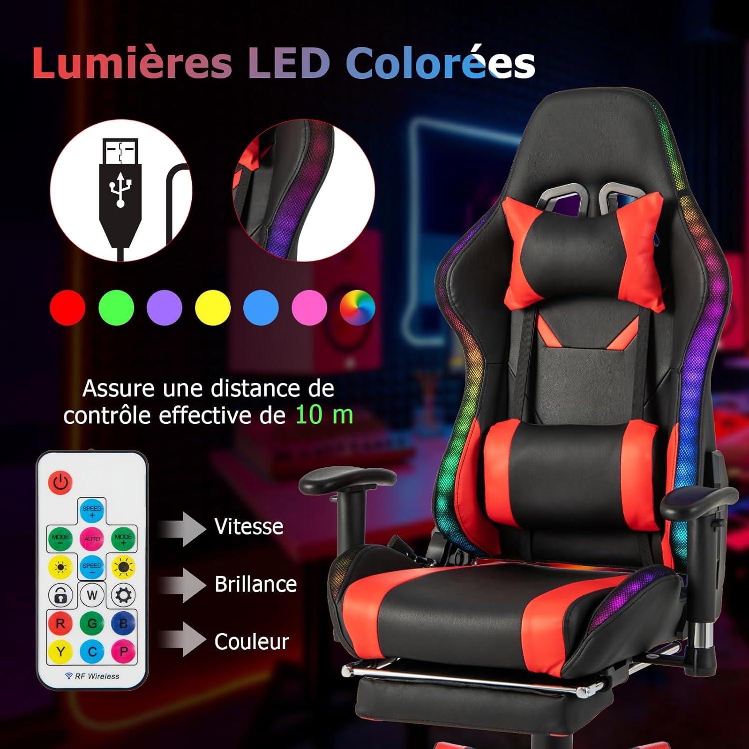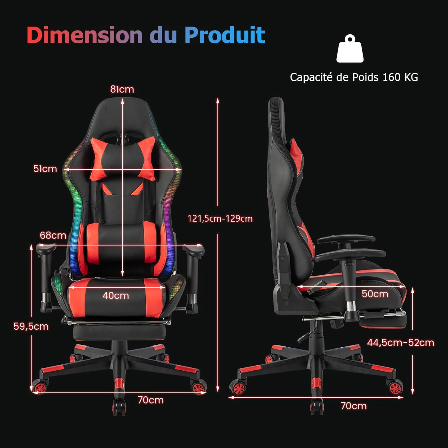 - Ceinture lumineuse colorée et sac de rangement : le bord du dossier de la chaise est équipé d'une ceinture lumineuse colorée, qui peut être utilisée pour augmenter l'atmosphère du jeu lorsque vous jouez. Il y a aussi un sac de rangement sur le dossier de la chaise, qui peut être utilisé pour ranger des articles. La chaise de jeu pratique et magnifique est très adaptée pour les cybercafés, les maisons ou les bureaux.