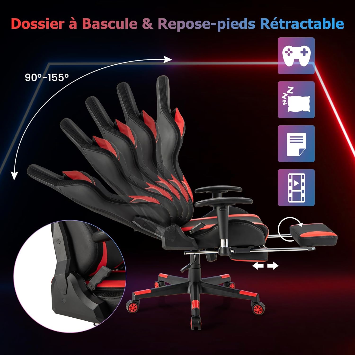 - Dossier réglable et pédales rétractables : vous pouvez ajuster l'angle du dossier entre 90 ° et 115 ° selon vos besoins pour trouver votre position la plus confortable pour travailler, jouer ou regarder des vidéos. Les pédales métalliques sous la chaise peuvent être étendues et rétractées à volonté, vous pouvez choisir de vous asseoir ou de vous allonger pour se reposer.